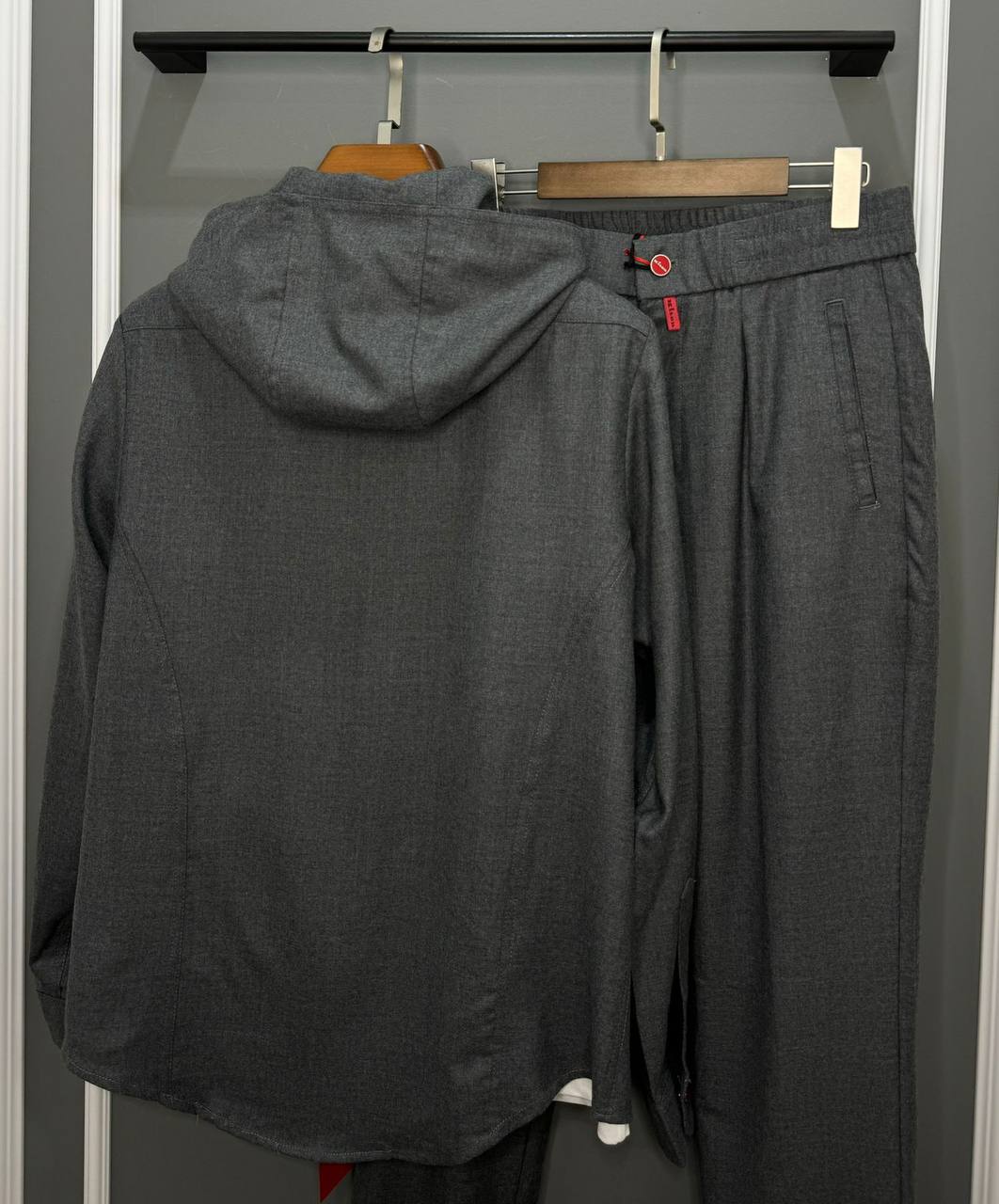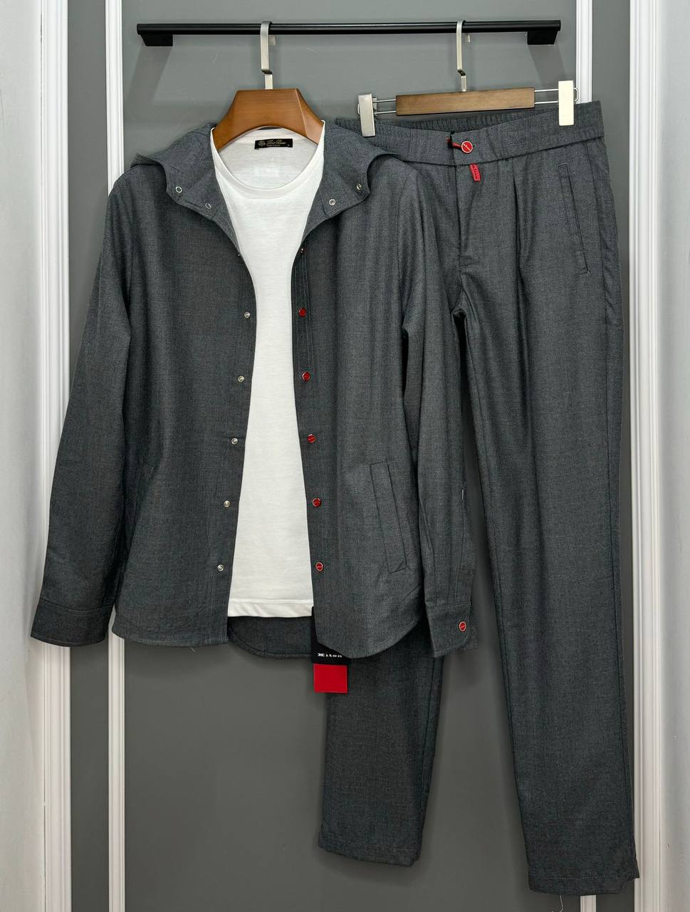 Костюм мужской Kiton LUX-110432 представляет собой стильный и современный комплект, включающий в себя куртку с капюшоном и брюки. Комплект выполнен в классическом сером цвете, что делает его универсальным для различных образов. Текстура ткани создает элегантный внешний вид, подходящий как для повседневной носки, так и для более формальных мероприятий.