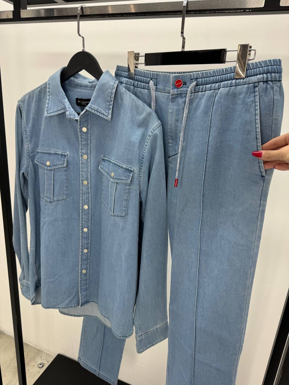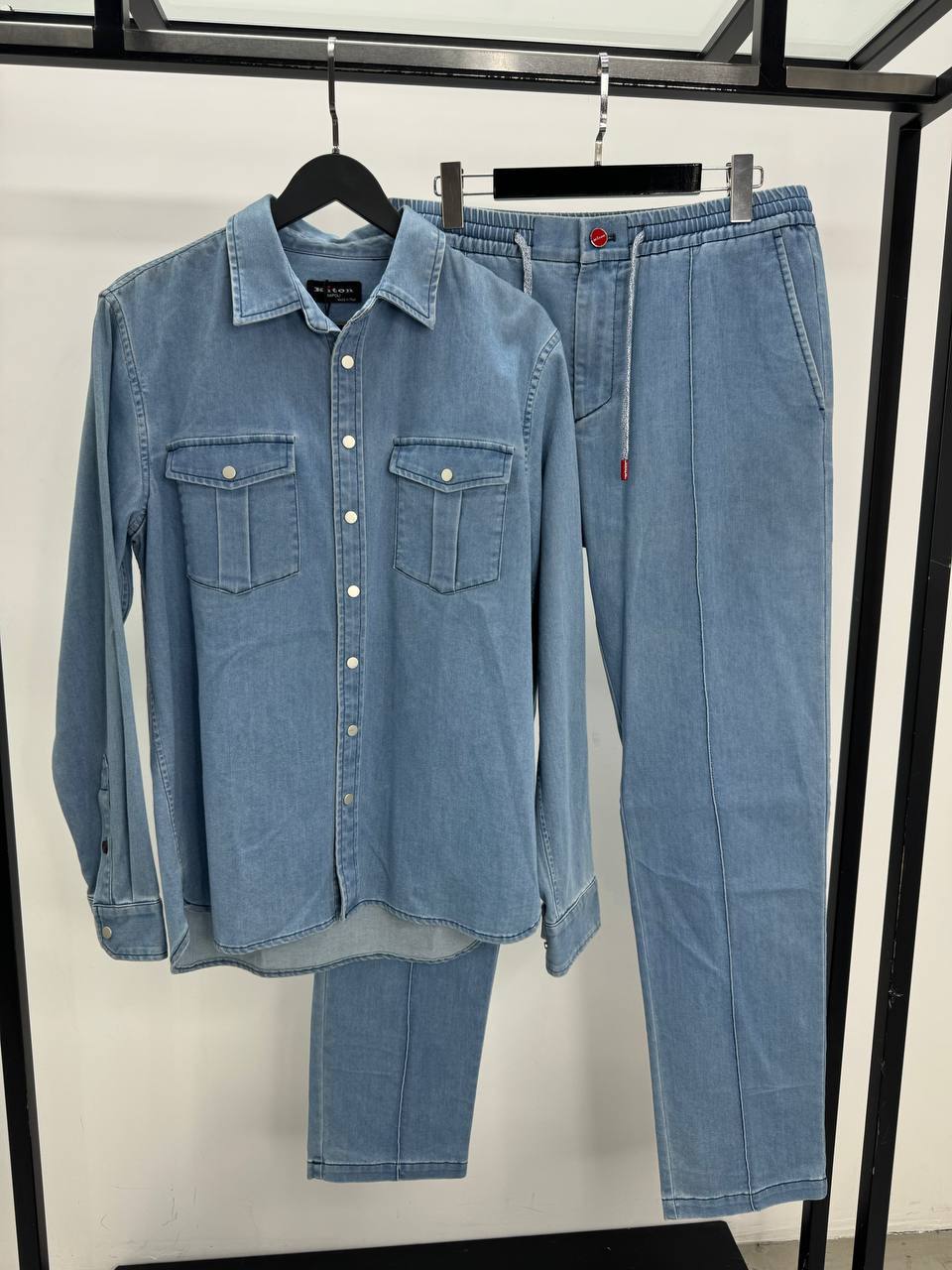 Костюм мужской Kiton LUX-118918 представляет собой стильный комплект, выполненный в современном стиле. Комплект включает в себя рубашку с длинным рукавом и брюки из денима светло-голубого цвета. Этот костюм идеально подходит для создания повседневного, но элегантного образа.