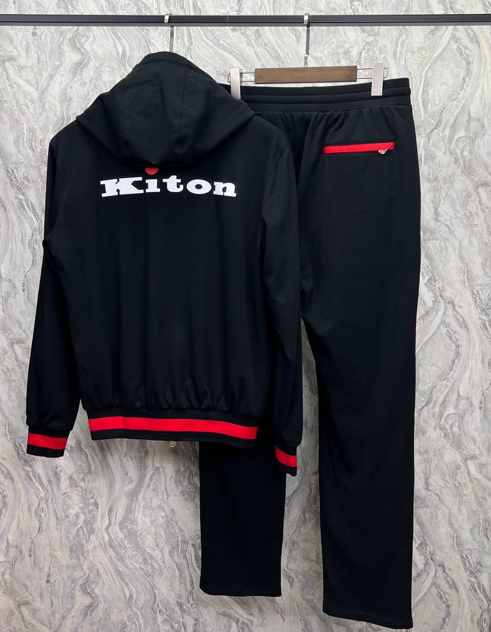 Костюм спортивный Kiton LUX-89097 - это стильный спортивный костюм для мужчин, который сочетает в себе элегантность и комфорт. Комплект состоит из худи на молнии и брюк. Черный цвет костюма дополнен красными элементами, создавая яркий акцент. Прекрасно подойдет для повседневной носки, занятий спортом или активного отдыха.