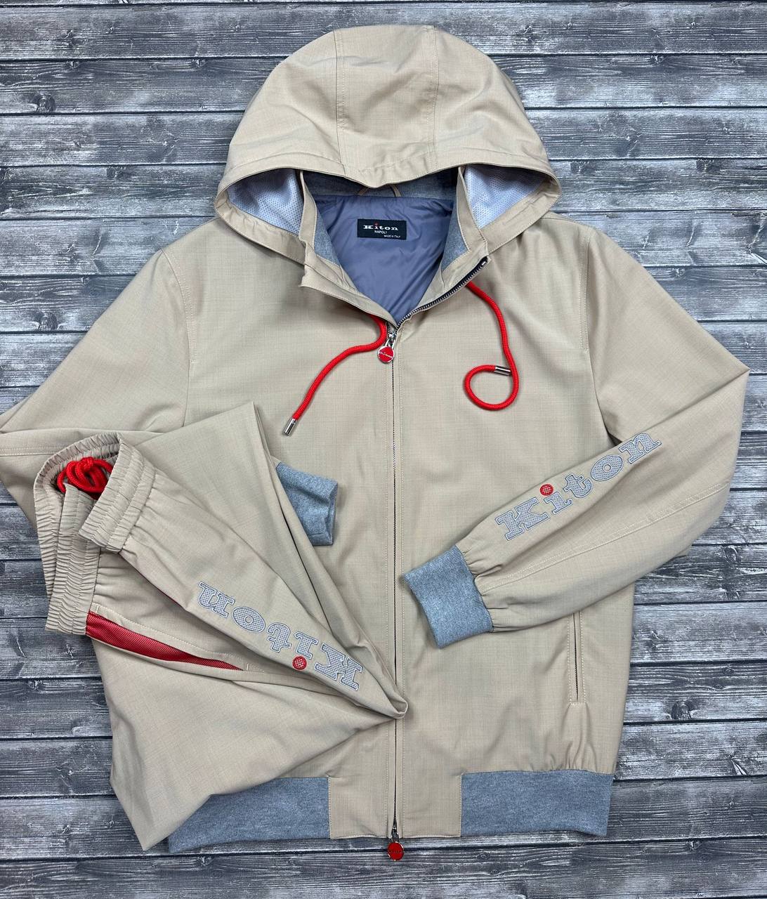 Костюм спортивный Kiton LUX-93894 представляет собой стильный спортивный комплект в нейтральных тонах. Костюм состоит из куртки с капюшоном и спортивных брюк, выполненных в песочном цвете с серыми и красными акцентами. Этот костюм подойдет для создания как спортивных, так и повседневных образов.