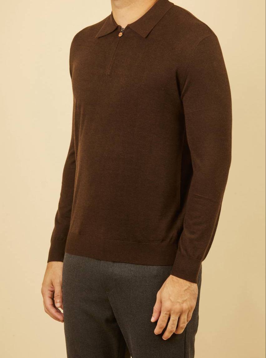 На фотографии представлена изысканная поло Kiton, выполненная в благородном коричневом цвете. Эта элегантная модель с длинными рукавами идеально подойдет для создания стильного и комфортного образа.