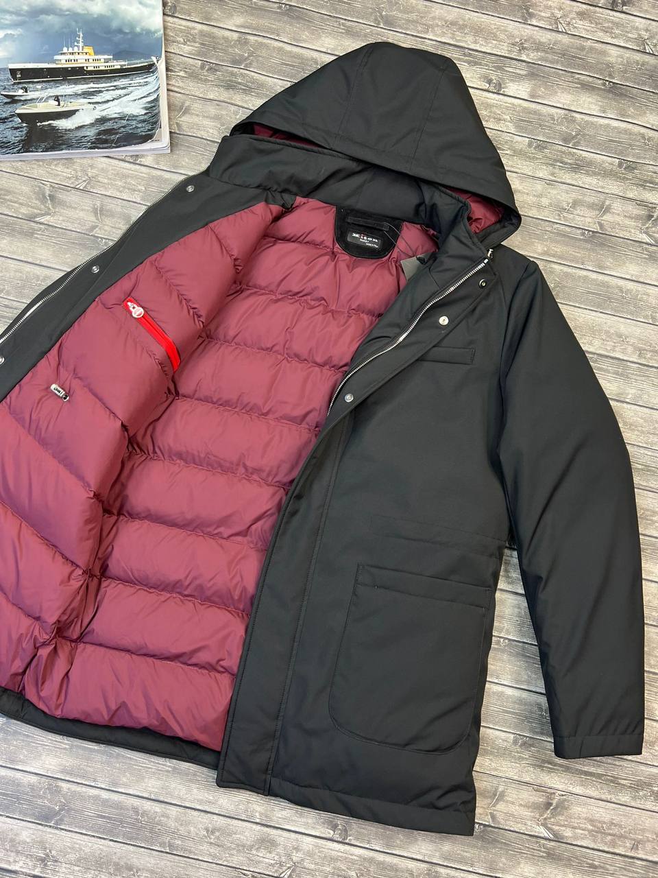 Пуховик Kiton LUX-101039 - это стильная мужская куртка черного цвета с капюшоном. Она имеет минималистичный дизайн с двумя большими карманами спереди и одним на груди. Куртка идеально подходит для повседневной носки в холодную погоду.