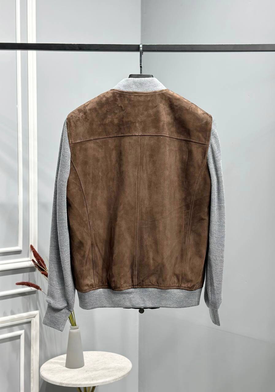Куртка из натуральной замши с рукавами из кашемира Kiton LUX-95188 – это воплощение элегантности и комфорта. Дизайн куртки сочетает в себе классический крой бомбера с роскошными материалами, создавая универсальный предмет гардероба. Основной цвет – насыщенный коричневый, дополненный серыми рукавами.