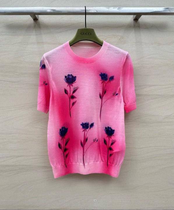 Кофта LUX-106760 от Gucci - это стильная кофта с короткими рукавами и круглым вырезом. Она выполнена в ярком розовом цвете с градиентным переходом. Кофта украшена цветочным принтом.