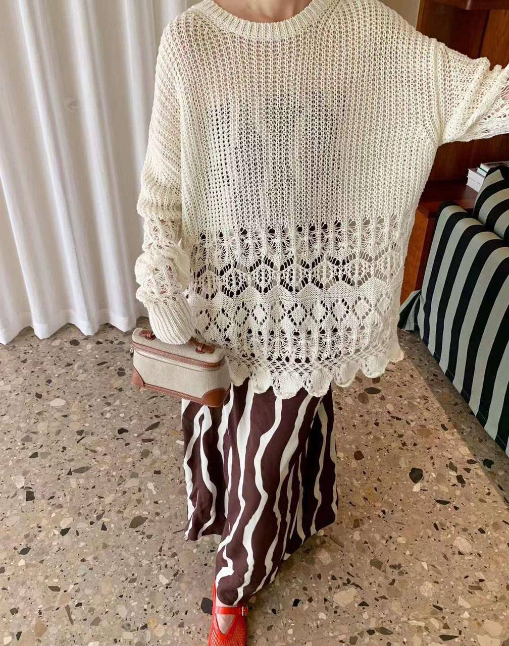 Кофта LUX-108271 представляет собой вязаный свитер свободного кроя кремового цвета. Особенностью модели является ажурный узор в нижней части кофты и на рукавах. Эта кофта может стать отличным дополнением к повседневному образу, добавляя женственности и легкости.