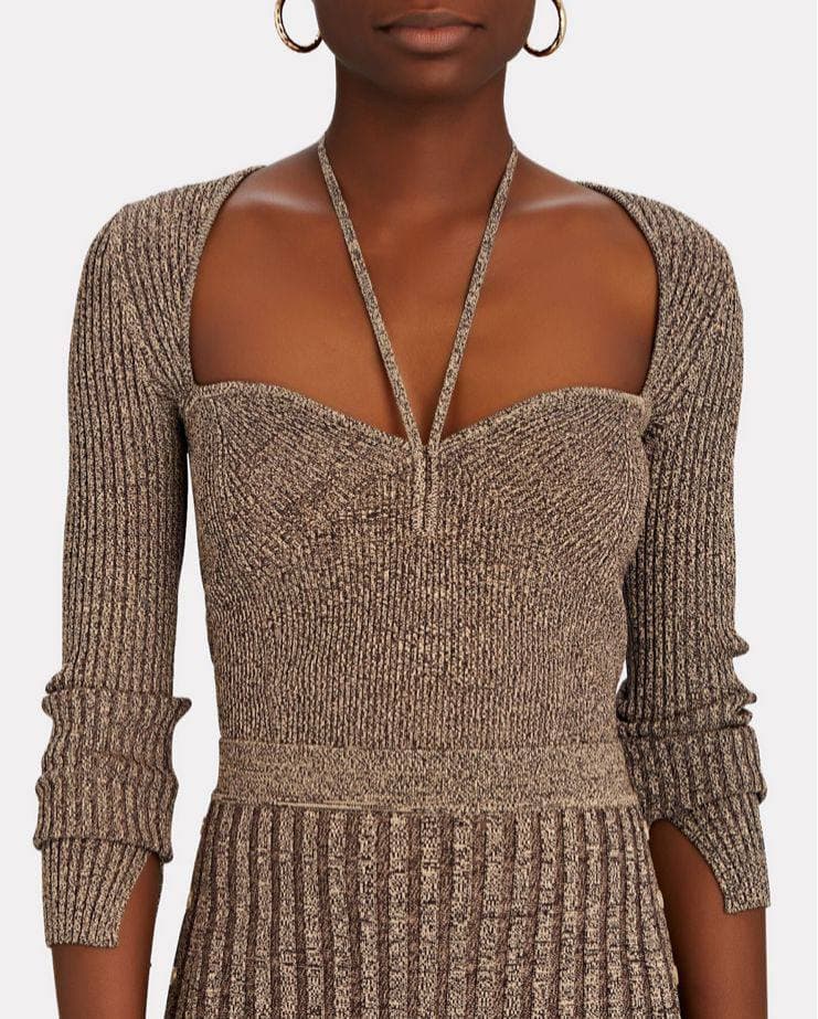 Эта коричневая кофта с люрексом от LUX-CRIME воплощает в себе элегантность и современный стиль. Модель имеет прилегающий силуэт, декольте-халтер с V-образным вырезом и длинные рукава с разрезами, что придает ей изысканности. Кофта идеально подходит для создания вечерних и стильных повседневных образов.