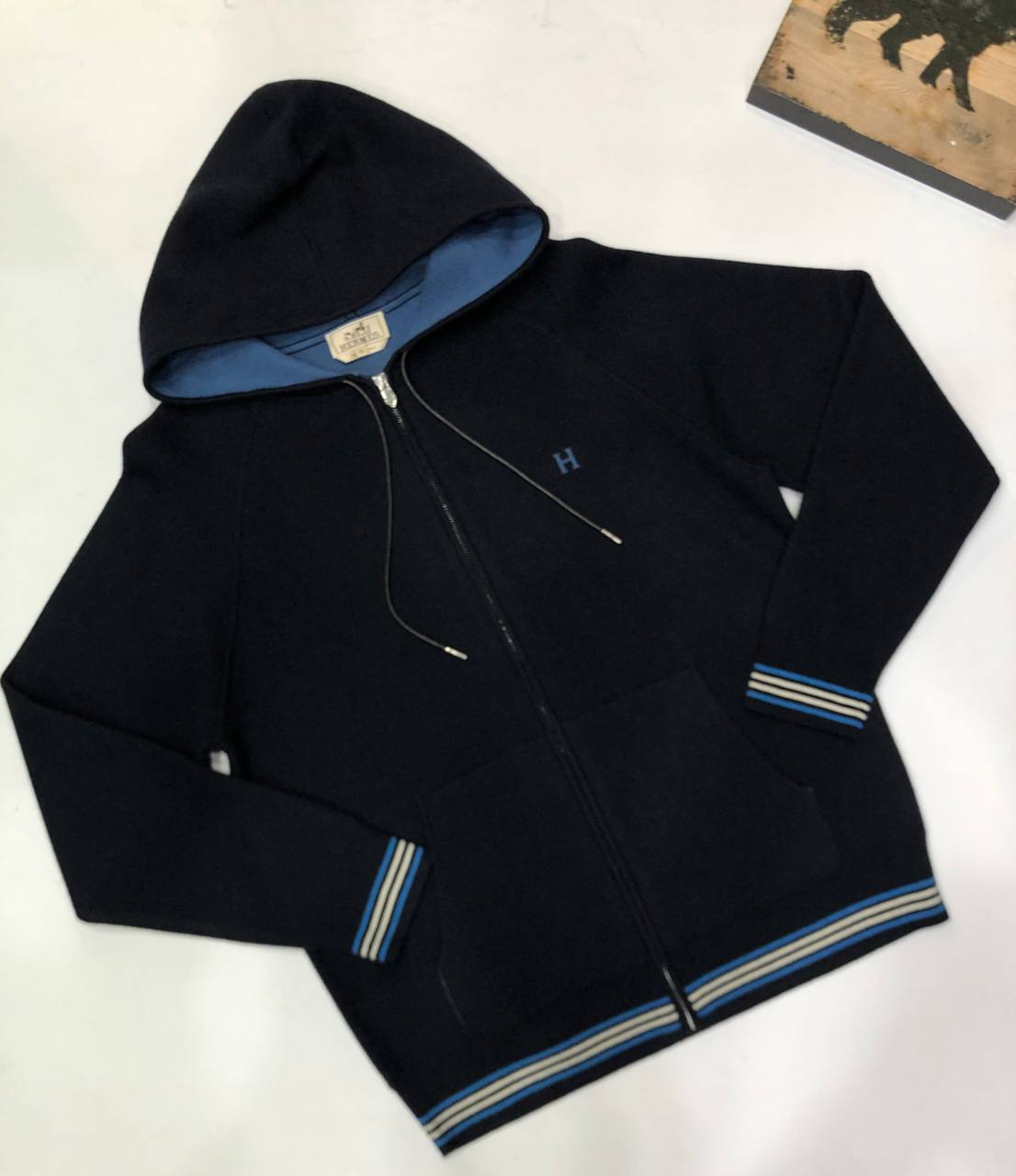 Детали: вышитая буква "H" на груди, контрастная подкладка капюшона, трикотажные манжеты и низ с полосками