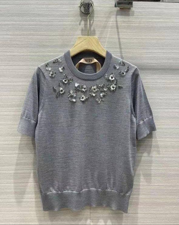 Эта серая кофта N21 с коротким рукавом выполнена в элегантном стиле, идеально подходящем для создания изысканных образов. Декоративные цветочные аппликации с вышивкой, украшающие область груди, придают изделию особый шарм и утонченность. Аккуратная круглая горловина и эластичные манжеты на рукавах и по нижнему краю обеспечивают комфортную посадку.
