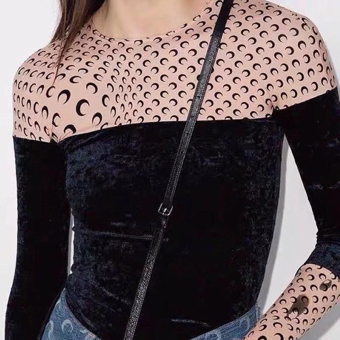 Кофта женская Marine Serre LUX-41547 представляет собой эффектный предмет одежды, сочетающий в себе два контрастных материала и фирменный принт бренда. Верхняя часть кофты выполнена из легкой ткани с повторяющимся принтом в виде полумесяцев на бежевом фоне, а нижняя часть и рукава — из черного бархатистого материала. Этот дизайнерский ход создает уникальный и узнаваемый образ, характерный для бренда Marine Serre.