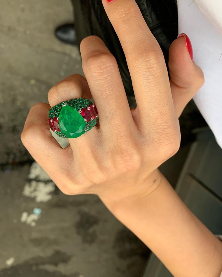 Это роскошное кольцо LUX-20551 от бренда LUXE-CRIME представляет собой изысканное украшение, выполненное в эклектичном стиле. Центральным элементом является крупный изумруд грушевидной огранки, окруженный сверкающими рубинами и мелкими зелеными камнями. Дизайн кольца придает ему величественный и в то же время современный вид, идеально подходит для особых случаев.