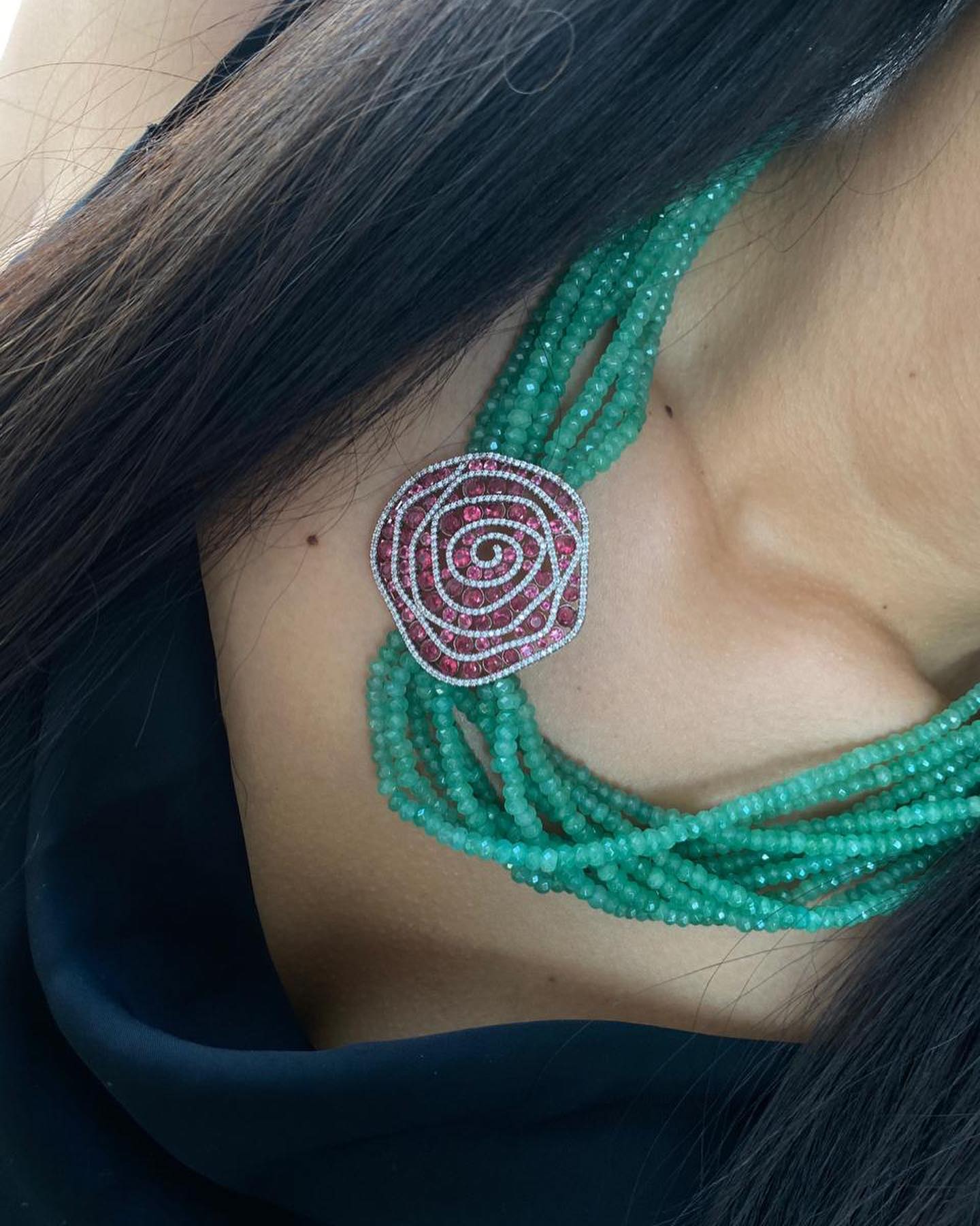 Колье LUX-33302 – это изысканное украшение, выполненное в элегантном стиле. Оно представляет собой многослойное ожерелье из мелких зеленых бусин, дополненное эффектным кулоном в форме розы. Центральный элемент кулона инкрустирован мелкими красными камнями, окруженными сверкающими белыми кристаллами, что придает ему роскошный вид.