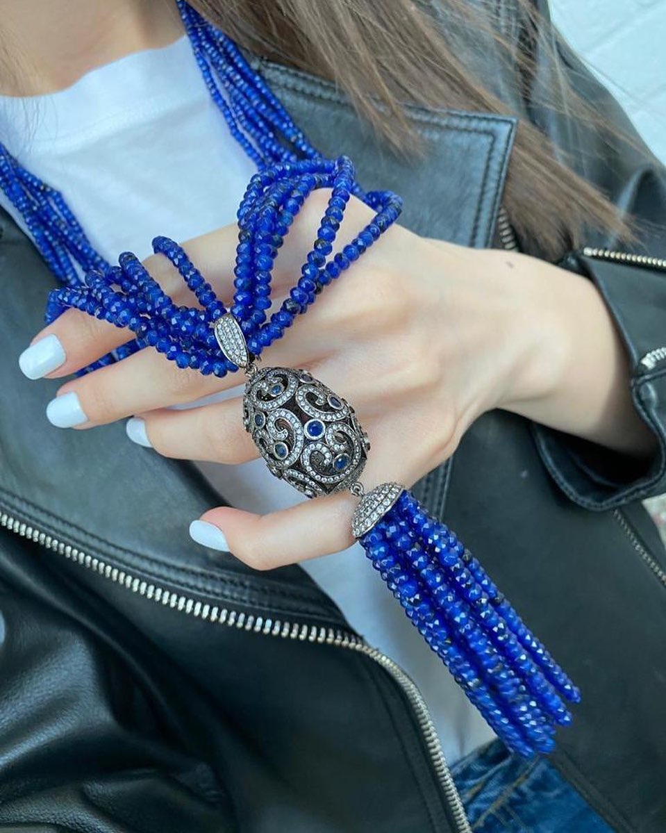 Это эффектное многорядное колье LUX-38969 от бренда Luxe, выполненное в винтажном стиле. Оригинальный дизайн украшения с подвеской в виде яйца, инкрустированной синими камнями и белыми кристаллами, а также кисточкой из синих бусин, привлекает внимание. Аксессуар станет изысканным дополнением к вечерним нарядам или добавит нотку роскоши повседневному образу.