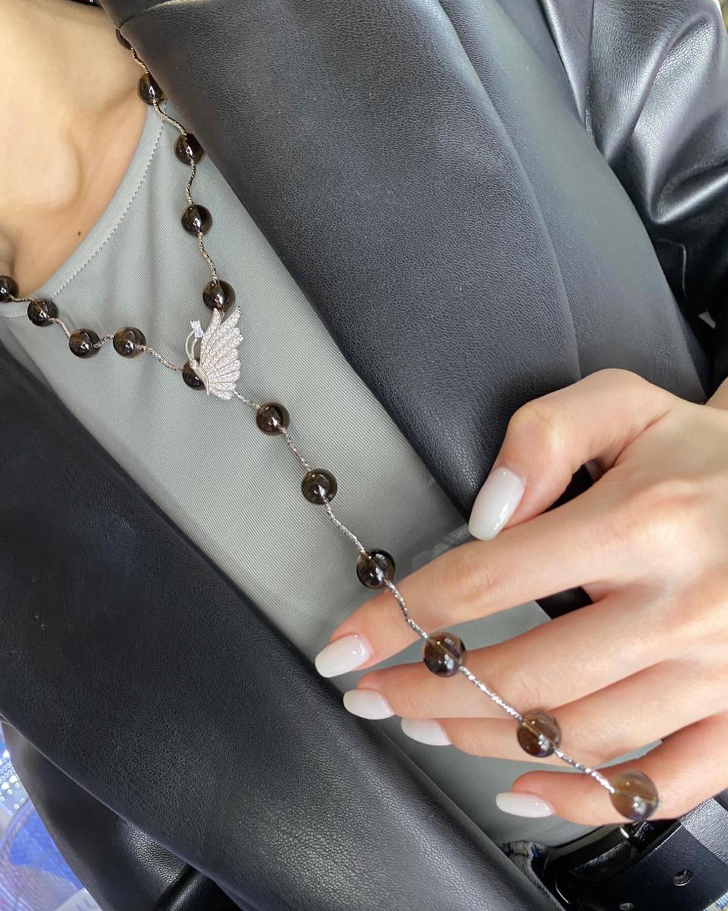 Колье LUX-40621 от Luxe Crime представляет собой элегантное украшение, выполненное в современном стиле. Центральный элемент изделия – изящная подвеска в виде стилизованного крыла, инкрустированная сверкающими камнями, что придает ему особую изысканность. На тонкой цепочке расположены гладкие бусины из дымчатого кварца, гармонично дополняющие блеск подвески.