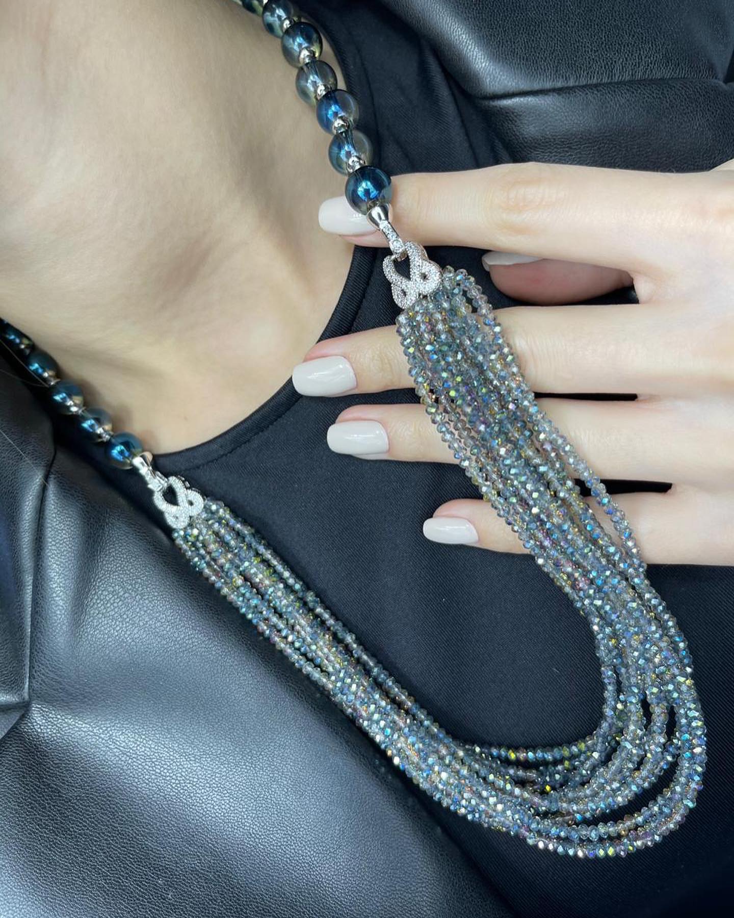 Это изысканное колье LUCE-40737 является воплощением элегантности и стиля. Центральным элементом является крупная синяя жемчужина, от которой исходят многочисленные нити мелких, переливающихся кристаллов, создавая эффект роскошного каскада. Дизайн колье сочетает в себе классическую утонченность и современную смелость, делая его идеальным дополнением к вечерним нарядам или строгим деловым костюмам.