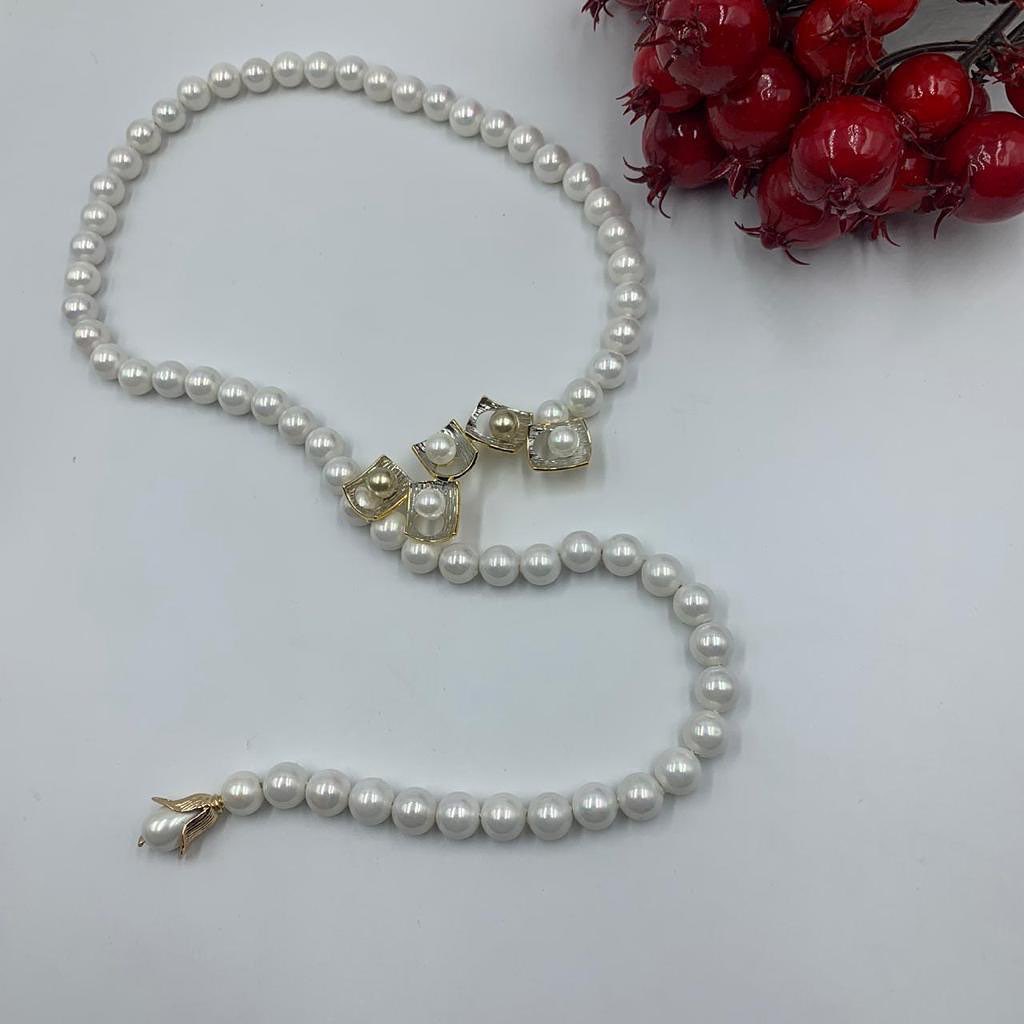 Это изысканное колье из жемчуга — воплощение элегантности и утонченности. Его дизайн подчеркивает классическую красоту жемчужин, дополненную оригинальными квадратными элементами с золотистыми вставками. Аксессуар идеально подойдет для создания утонченных вечерних и дневных образов, придавая им особый шарм.