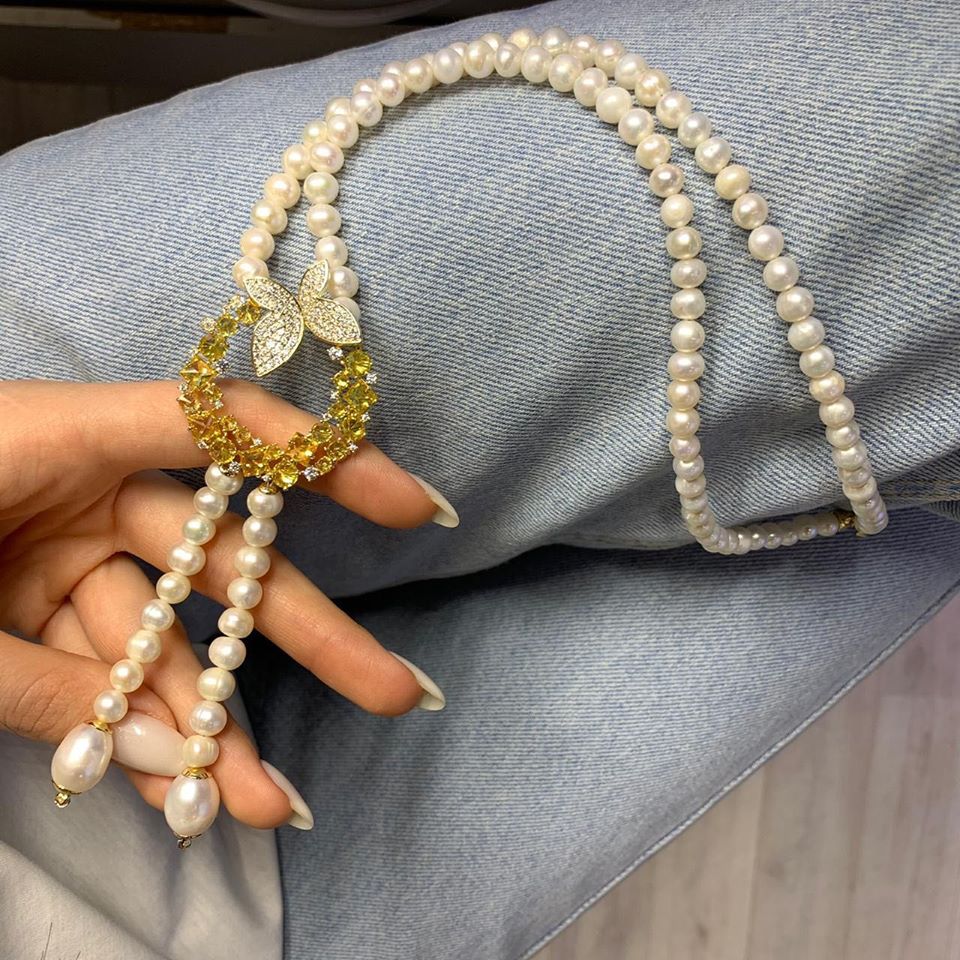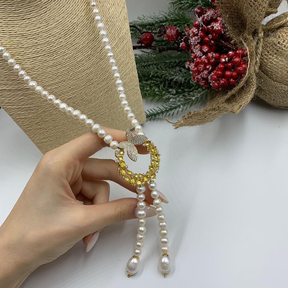 Колье LUX-25152 – изысканное украшение, выполненное в классическом стиле с оригинальным современным акцентом. Дизайн колье сочетает в себе элегантность натурального жемчуга и сияние цирконов, образуя подвеску в виде круга с бабочкой. Центральным элементом является золотистый круг, украшенный мелкими желтыми камнями и сверкающими цирконами, а также изящная бабочка, инкрустированная камнями. Этот аксессуар призван подчеркнуть утонченность образа.