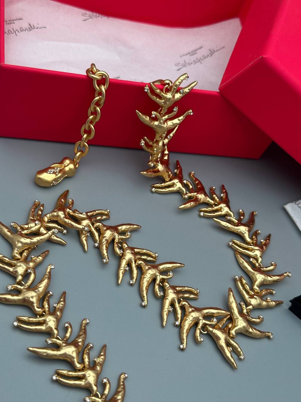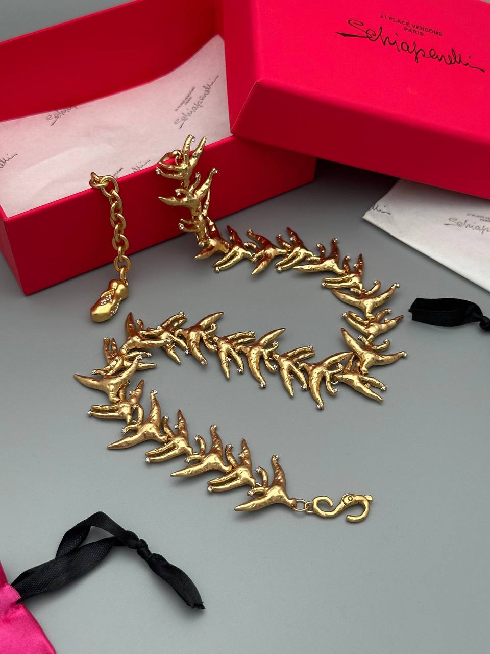 Изысканное колье от Schiaparelli – это смелое и оригинальное украшение, которое подчеркнет индивидуальность и добавит неповторимый акцент в образ. Колье выполнено в узнаваемом стиле бренда.