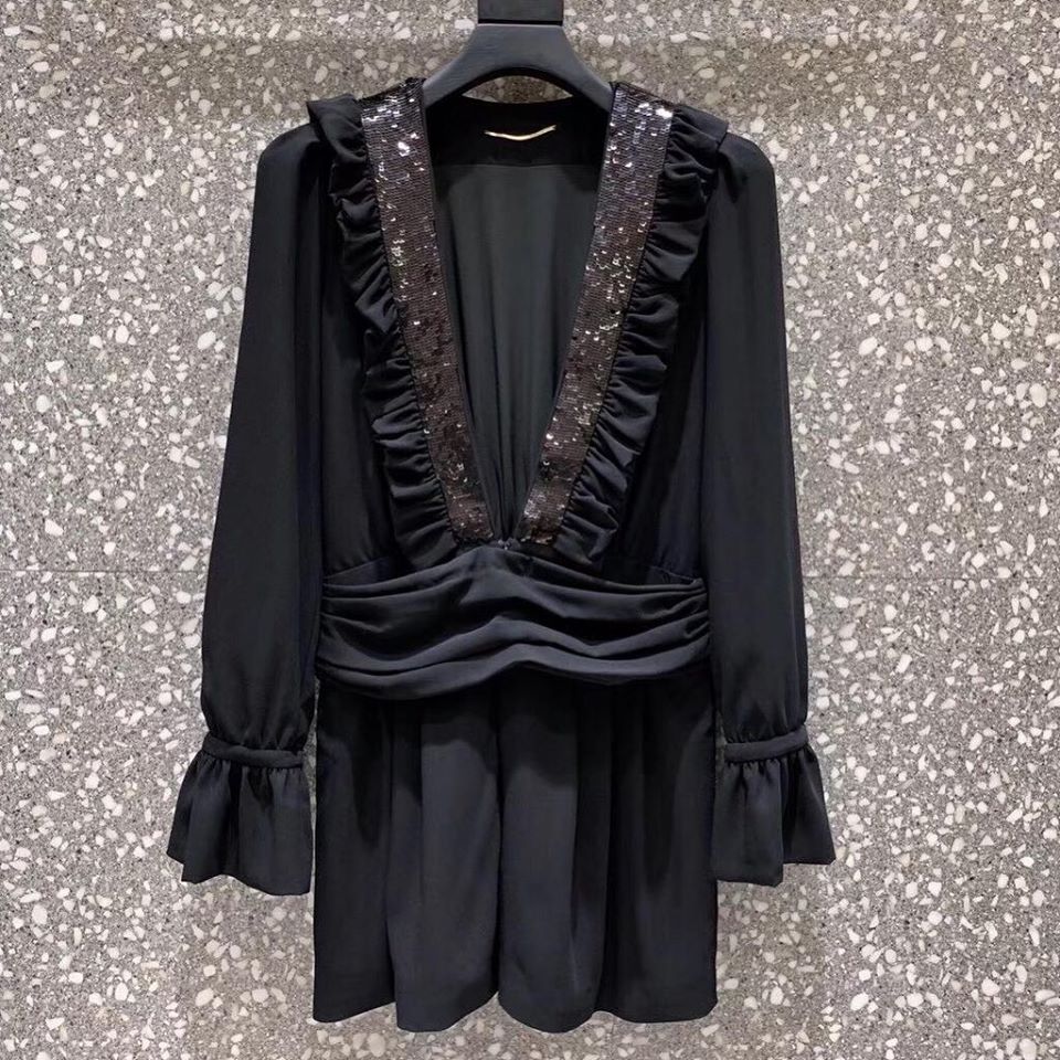 Комбинезон LUX-25588 – это элегантное вечернее решение от бренда LUXE, сочетающее в себе классический черный цвет и актуальный дизайн. Модель привлекает внимание глубоким V-образным вырезом, украшенным оборками и мерцающими пайетками, что придает образу особую изысканность. Длинные рукава с расклешенными манжетами и драпировка на талии подчеркивают женственный силуэт.