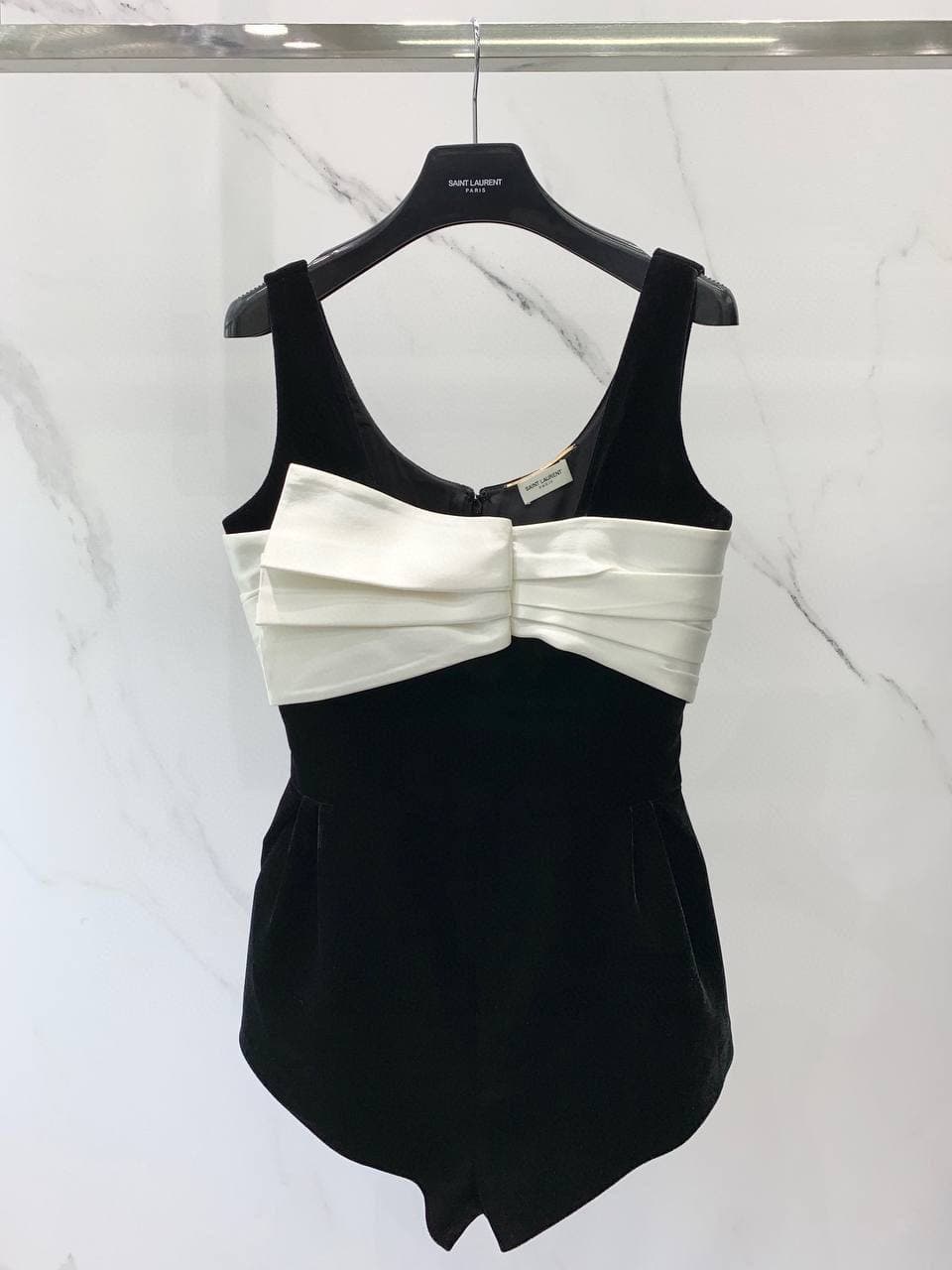 Комбинезон LUX-62997 от Saint Laurent Paris — это элегантное решение для современных женщин, сочетающее в себе изысканность и комфорт. Модель выполнена в контрастном черно-белом дизайне, акцентированном бантом спереди, что придает образу особую женственность и роскошь.