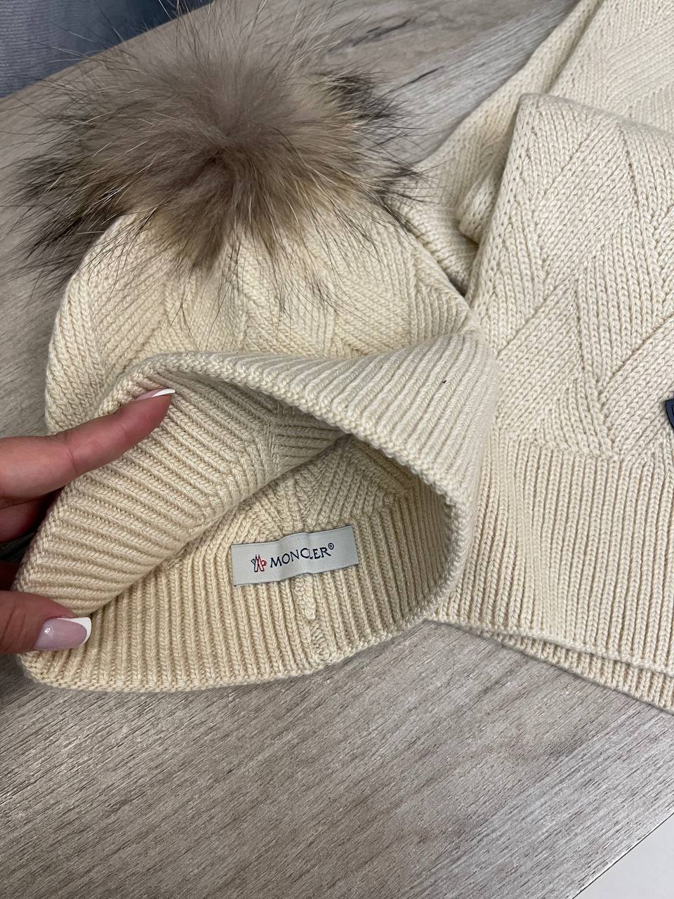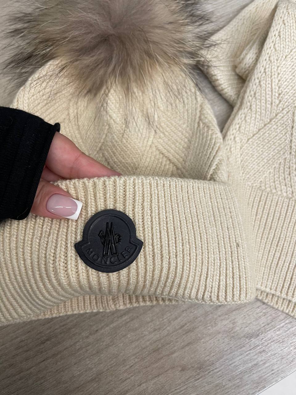 Комплект Moncler, состоящий из шапки с помпоном и шарфа, выполнен в едином стиле и цвете. Эти аксессуары не только согреют в холодную погоду, но и добавят элегантности вашему образу.