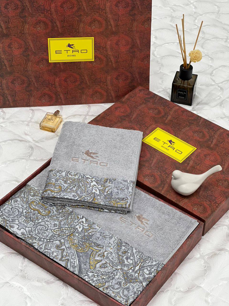 Комплект из 2х полотенец Etro Home, LUX-76193 представляет собой элегантный набор для ванной комнаты. Полотенца выполнены в светло-серой цветовой гамме с детальным узором по краям. Такой дизайн придает изделиям изысканный и современный вид.
