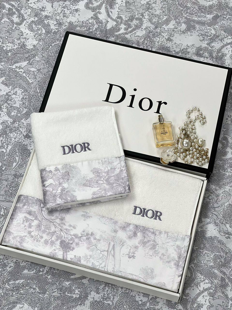 Комплект из 2х полотенец Christian Dior LUX-78925 представляет собой изысканный аксессуар для ванной комнаты. Комплект выполнен в классическом стиле, сочетая белый цвет основы с серым рисунком. Текстура полотенец мягкая и приятная на ощупь, что делает их идеальными для ежедневного использования.