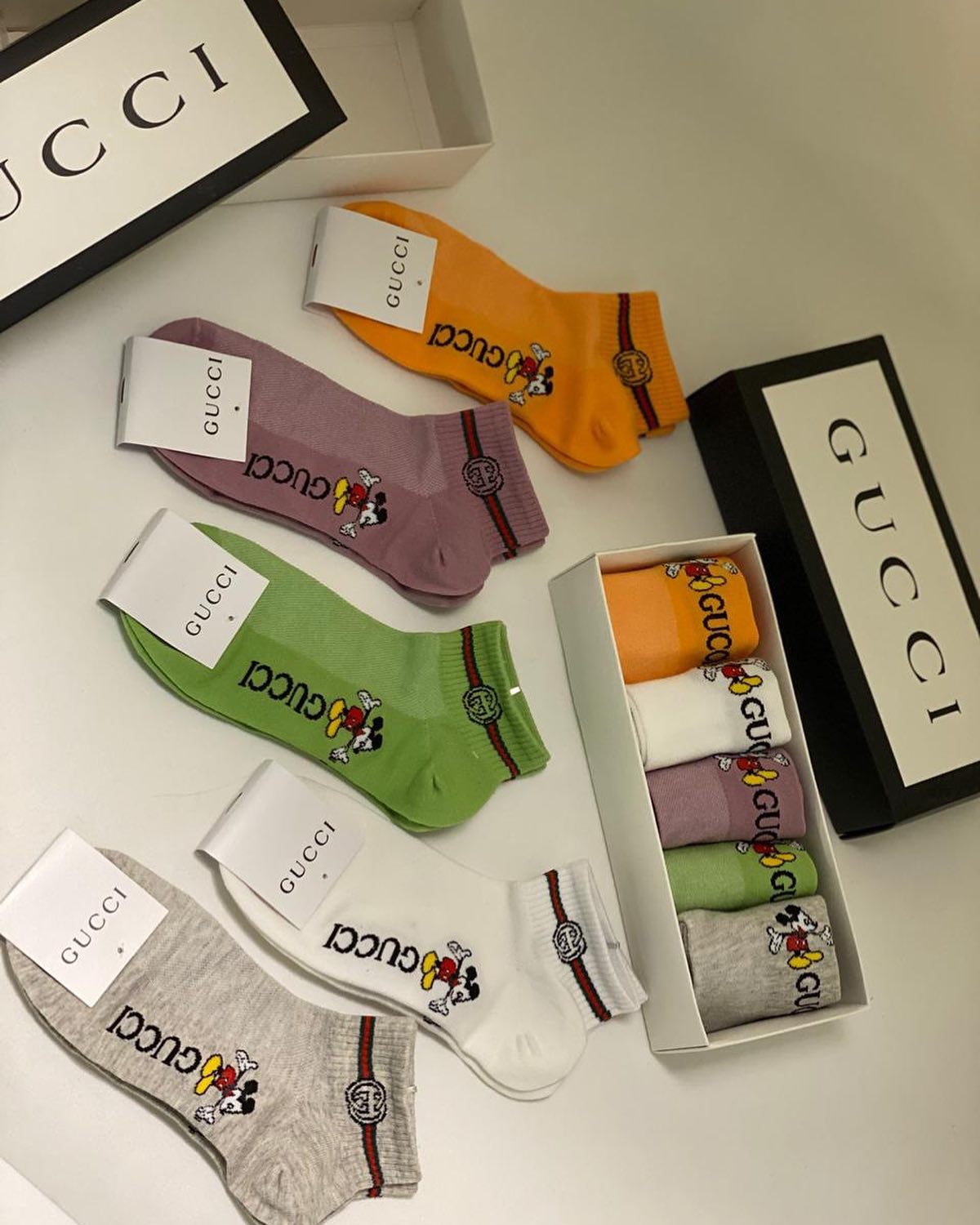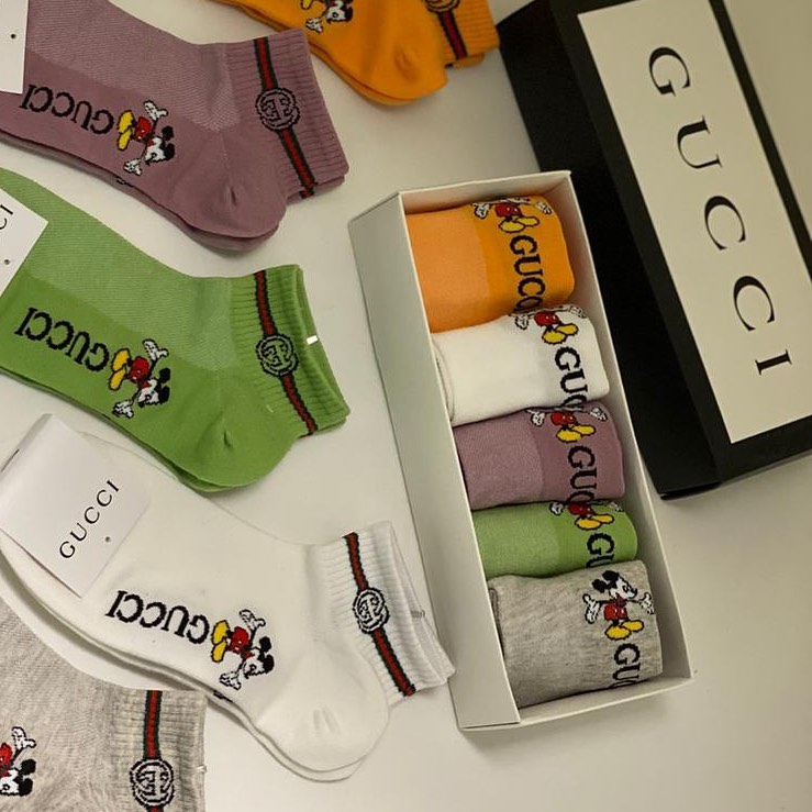 Комплект из 5 пар носков Gucci LUX-30976 представляет собой стильный и удобный набор аксессуаров для повседневного гардероба. Каждый носок украшен узнаваемым логотипом бренда и изображением персонажа Микки Мауса, выполненным в ярких или классических цветах, что придает изделиям игривый и модный вид. Этот комплект отлично подойдет для тех, кто ценит комфорт и желает добавить оригинальности своим образам.
