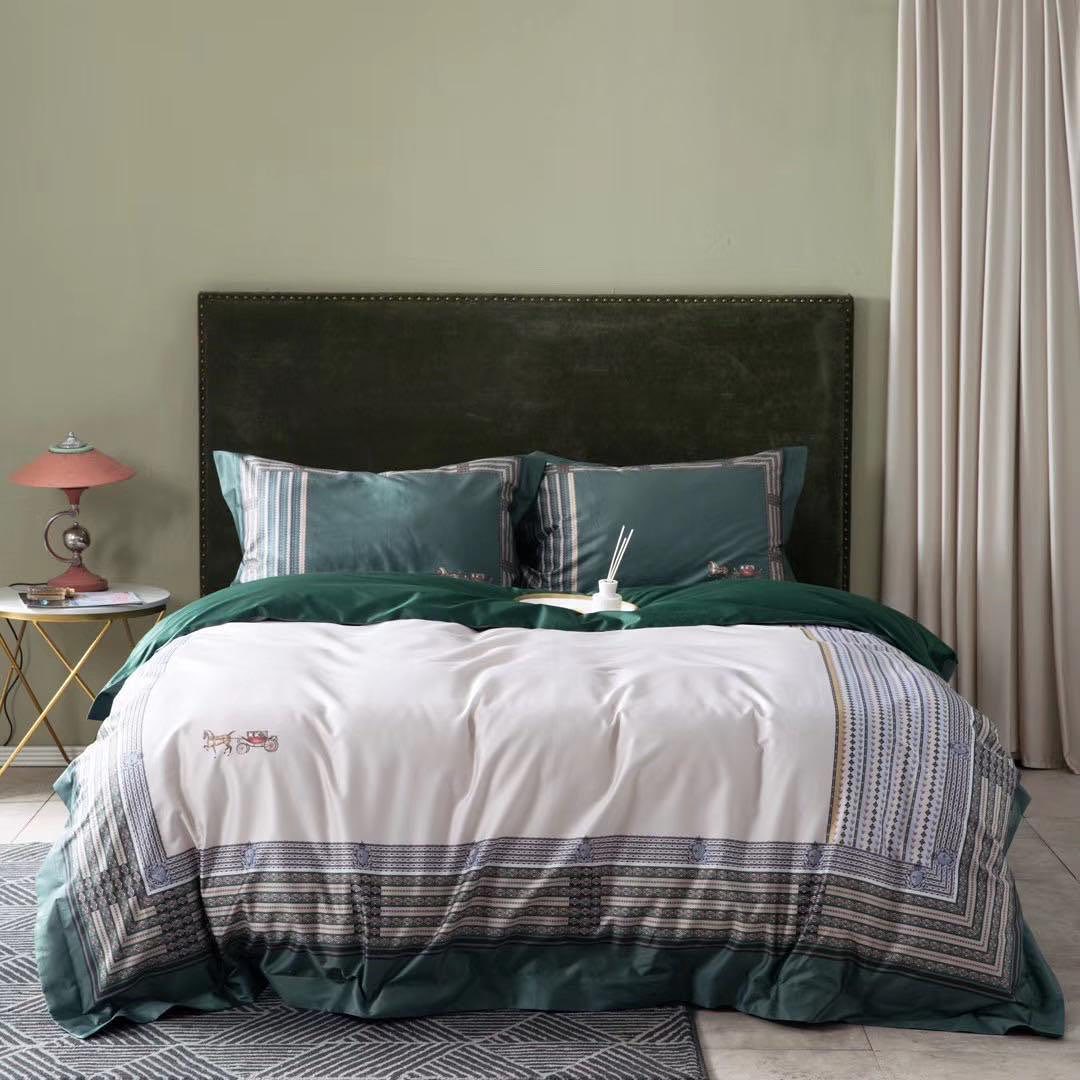 Комплект постельного белья Hermes LUX-33335 представляет собой элегантное решение для спальни, выполненное в классическом стиле. Дизайн включает в себя сочетание белого, темно-зеленого и декоративных узоров, создавая утонченную атмосферу. Комплект украшен вышитой каретой, что придает ему особый шарм и изысканность.