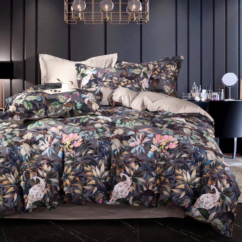 Комплект постельного белья LUX-51866 от бренда LUXE-CRIME представляет собой роскошное решение для спальни, выполненное в стиле экзотика. Дизайн с изображением пышной тропической растительности и изящных птиц создает атмосферу утонченной элегантности и уюта. Этот комплект призван преобразить интерьер вашей спальни, добавив в него нотки роскоши и природной красоты.
