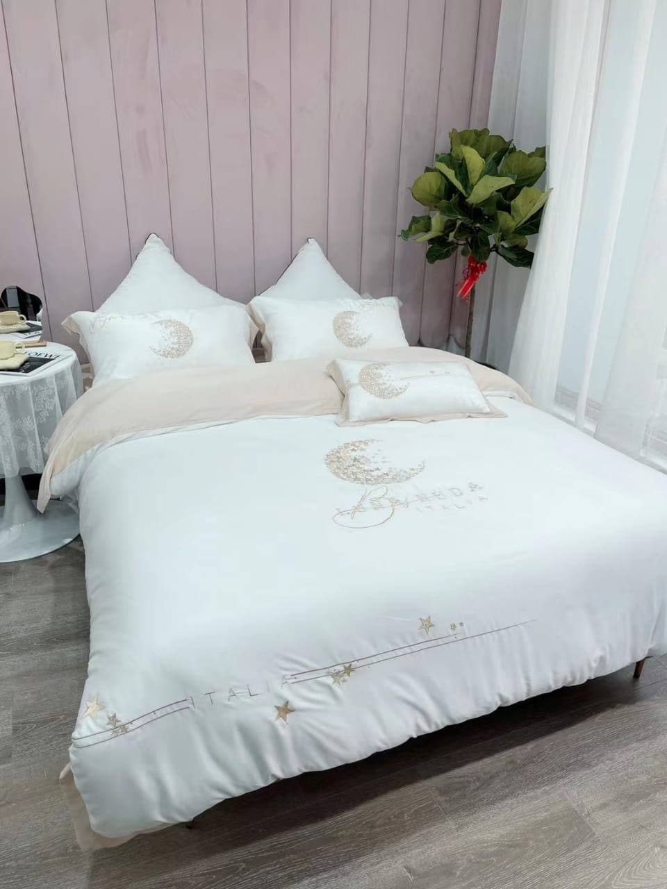 Комплект постельного белья LUX-58405 от бренда Luxe-crime представляет собой элегантное и стильное решение для вашей спальни. Дизайн выполнен в современном стиле, сочетая нежные оттенки с изысканным декором в виде луны и звезд, что создает атмосферу уюта и спокойствия. Этот комплект станет прекрасным дополнением к интерьеру, придавая ему нотку роскоши.