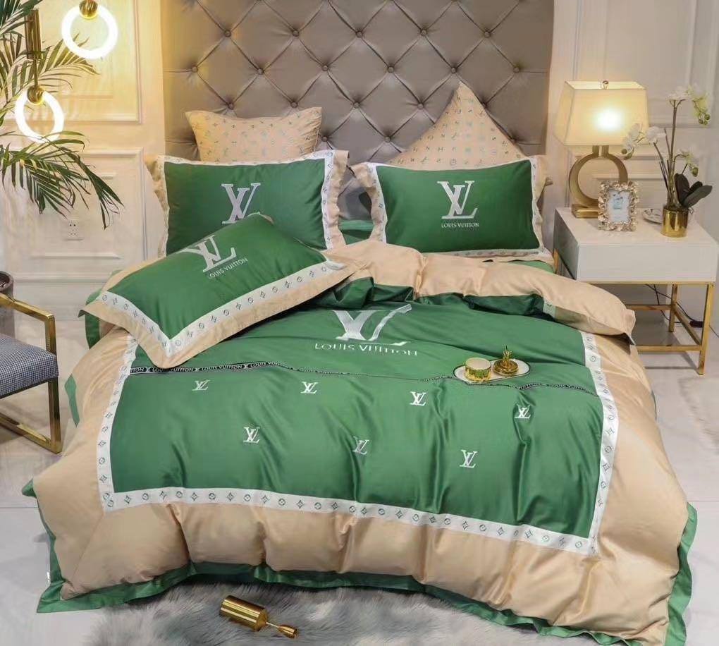 Представленный комплект постельного белья Louis Vuitton LUX-31098 отличается роскошным дизайном, сочетающим глубокий зеленый цвет с элементами фирменного монограммного рисунка бренда. Этот комплект создан для тех, кто ценит эксклюзивность и стремится придать своей спальне атмосферу элегантности и утонченности.