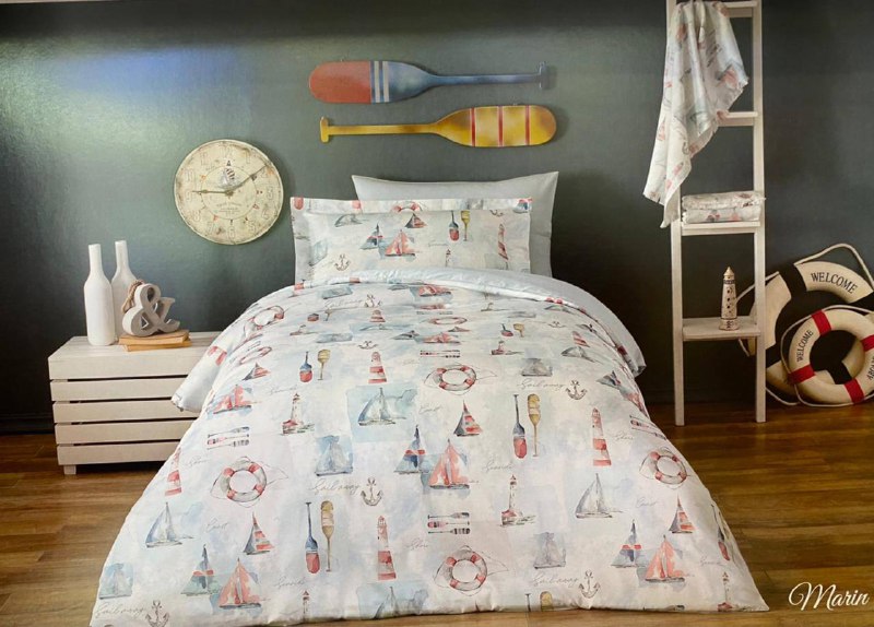 Комплект постельного белья детский LUX-56237 от бренда Luxe-crime — это прекрасное решение для детской комнаты, оформленной в морской тематике. Его дизайн, напоминающий акварельные зарисовки парусников, маяков и спасательных кругов, создает атмосферу приключений и безмятежности.