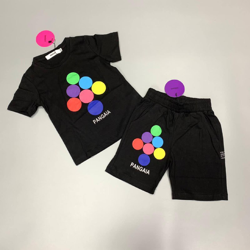 Представляем стильный черный костюм от бренда Pangaia, состоящий из футболки и шорт. Этот комплект отлично подойдет для создания ярких и непринужденных образов для мальчика. Оригинальный принт из разноцветных кругов и надпись "PANGAIA" делают его запоминающимся.