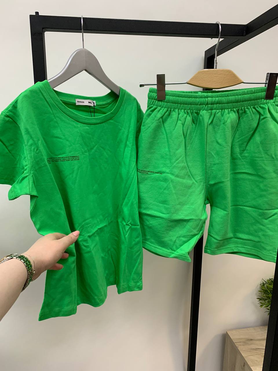 Этот костюм от бренда PANGAAIA, состоящий из футболки и шорт, выполнен в ярком зеленом цвете. Стиль модели — повседневный, что делает его идеальным выбором для создания расслабленных образов. На одежде присутствует минималистичная надпись, добавляющая изюминку дизайну.