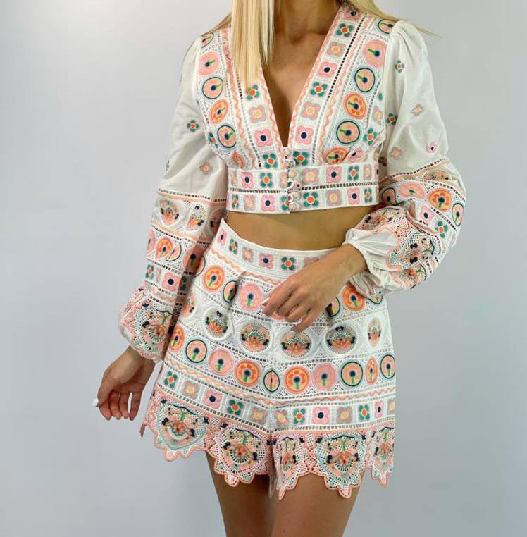 Этот элегантный костюм LUX-50696 от бренда LUXE CRIME представляет собой женский комплект, состоящий из кроп-топа с V-образным вырезом и шорт. Комплект выполнен в ярком, богемном стиле, украшен оригинальной вышивкой и кружевными элементами, создавая романтичный и летний образ. Такой костюм идеально подойдет для создания стильных повседневных или праздничных нарядов.