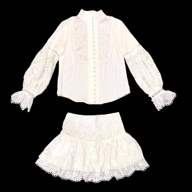 Этот элегантный женский костюм от LUX-CRIME, состоящий из блузы и юбки, выполнен в романтическом стиле с акцентом на кружевные детали. Блуза имеет высокий воротник, длинные пышные рукава с манжетами, украшенными кружевом, и ряд мелких пуговиц по центру. Юбка короткая, трапециевидной формы, также обильно украшена кружевными вставками и кружевным низом.