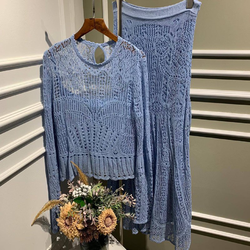 Представляем вашему вниманию элегантный вязаный костюм LUX-51996 от бренда LUXE. Этот комплект, состоящий из эффектного топа с длинным рукавом и юбки миди, выполнен в нежном голубом оттенке. Изделие обладает утонченным ажурным узором, который придает ему особую изысканность и женственность. Костюм идеально подходит для создания стильных повседневных и вечерних образов, позволяя чувствовать себя уверенно и комфортно.