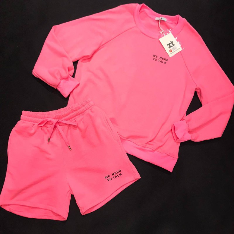 Костюм LUX-52334 от LUXE-CRIME представляет собой яркий и стильный комплект, выполненный в неоново-розовом цвете. Дизайн костюма, состоящий из свитшота и шорт, идеально подходит для создания расслабленных, но эффектных образов. Надпись "WE NEED TO TALK" на свитшоте и шортах добавляет образу игривости и индивидуальности.