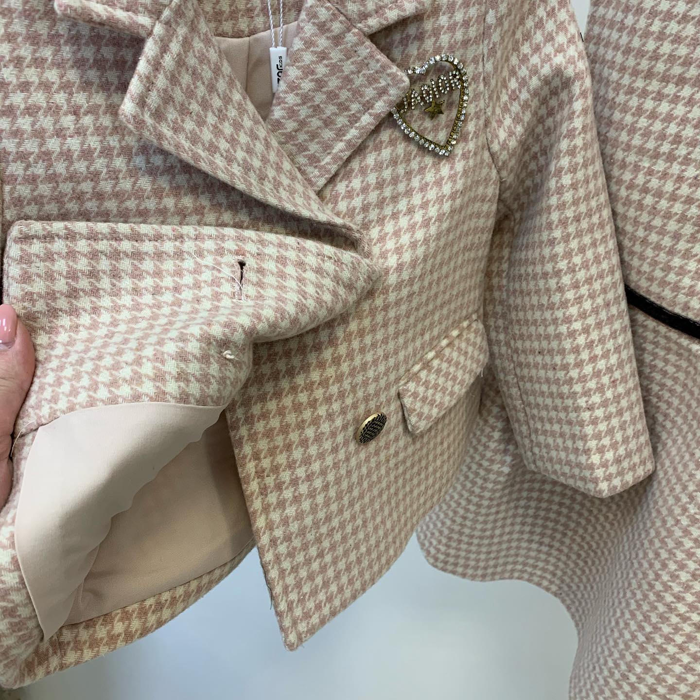Стильный детский костюм от бренда IZAR KIDS, выполненный в нежном розово-бежевом оттенке с классическим принтом "гусиная лапка". Этот элегантный комплект состоит из укороченного пиджака и платья, создавая изысканный образ для маленькой модницы. Декоративная брошь в форме сердца, украшенная стразами, добавляет образу особую изюминку.