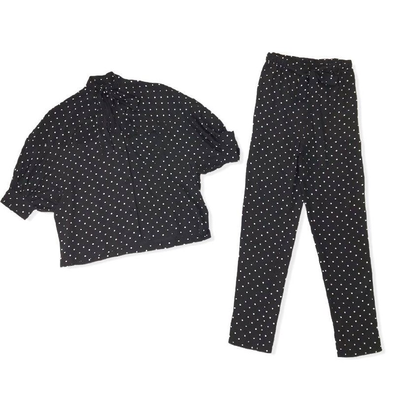 Представленный костюм LUX-52764 от бренда LUXE-CRIME — это элегантный и стильный комплект, состоящий из блузы и брюк, выполненных в черном цвете в мелкий белый горошек. Дизайн костюма подчеркивает женственность и создает изысканный образ, подходящий как для повседневного ношения, так и для особых случаев.