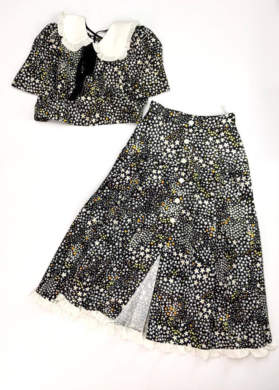 Костюм LUX-53163 от LUXE-CRIME представляет собой комплект из укороченного топа с пышными рукавами и длинной расклешенной юбки, выполненный в романтичном стиле. Оба элемента украшены мелким цветочным принтом на черном фоне, дополненным белой оборкой по краю топа и подола юбки, что придает образу легкость и игривость.