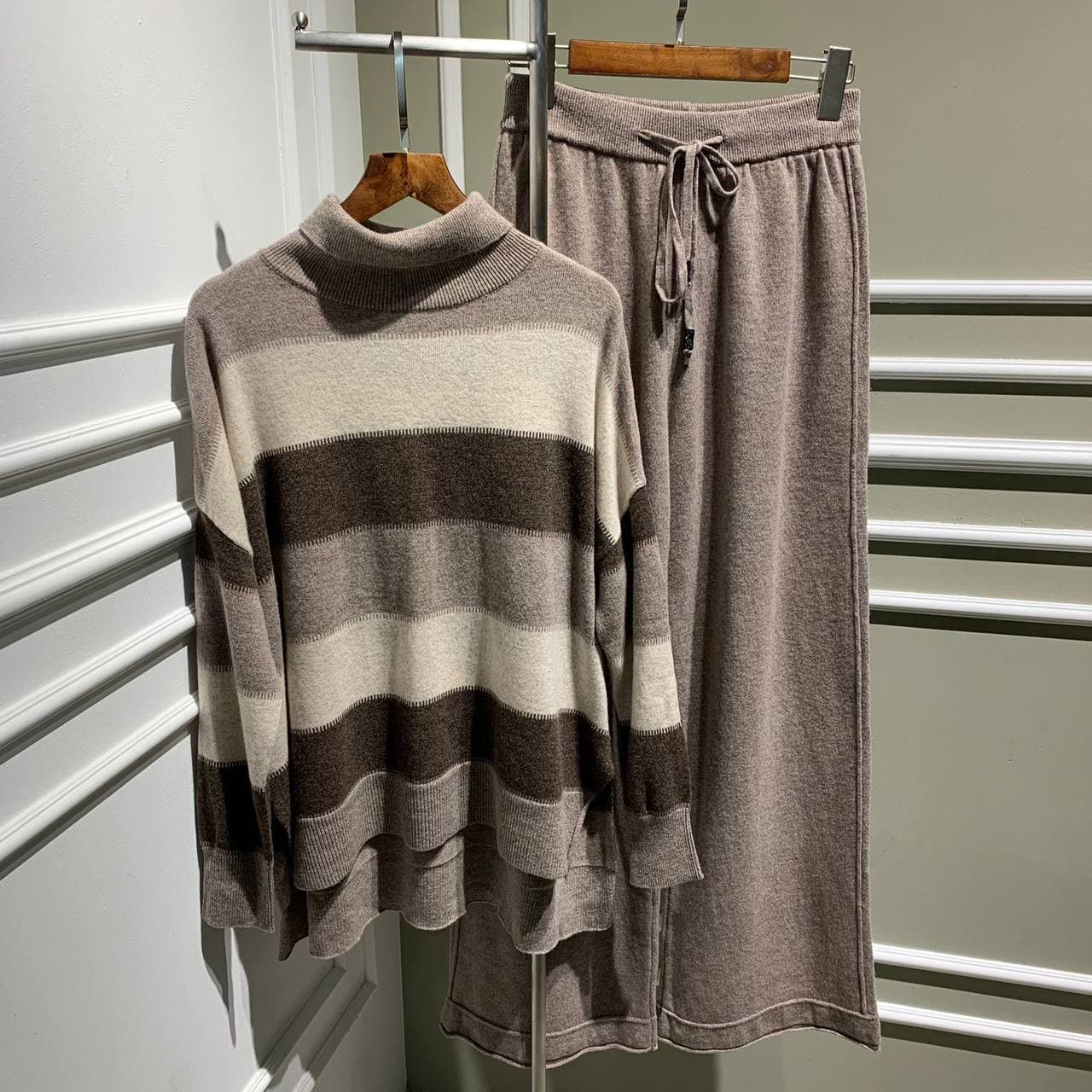 Представляем вам элегантный вязаный костюм LUX-57797, сочетающий в себе комфорт и стиль. Этот женский костюм, состоящий из джемпера с высоким воротником в горизонтальную полоску и прямых брюк, станет идеальным выбором для создания расслабленных, но изысканных образов. Он прекрасно подойдет как для повседневного ношения, так и для особых случаев, подчеркивая вашу индивидуальность.