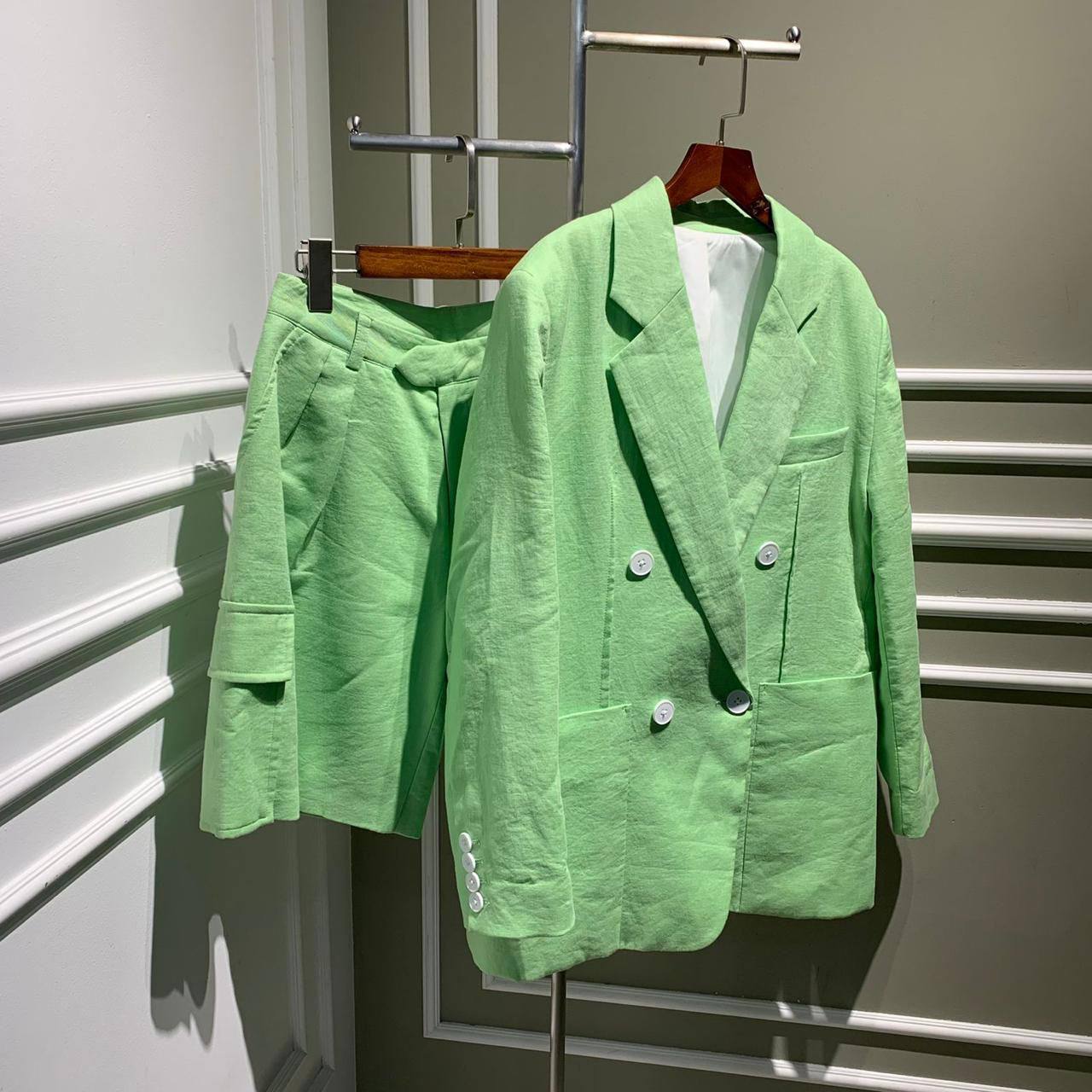 Костюм LUX-69796 - это элегантный костюм-двойка в ярком зеленом цвете. Комплект состоит из пиджака и шорт, выполненных в едином стиле. Текстура ткани создает легкий эффект мятости, что добавляет изделию непринужденности.