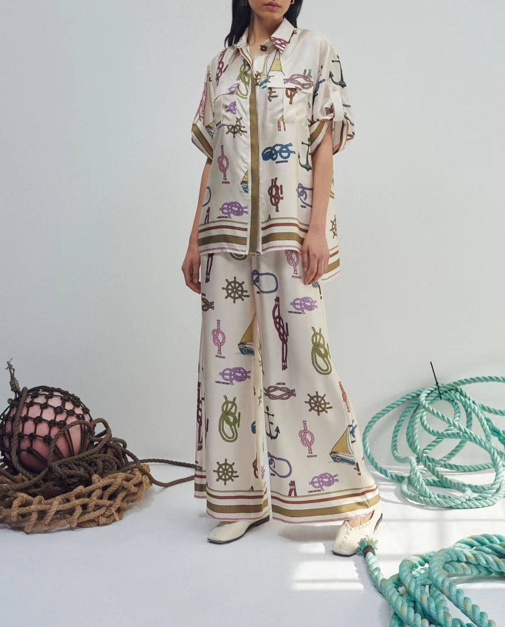 Костюм LUX-72317 - это стильный комплект одежды, который сочетает в себе элегантность и комфорт. Костюм выполнен в морском стиле, с принтом, изображающим морские узлы, штурвалы и якоря на светлом фоне. Костюм идеально подходит для создания летних образов, обеспечивая свободу движений и комфорт в течение дня.