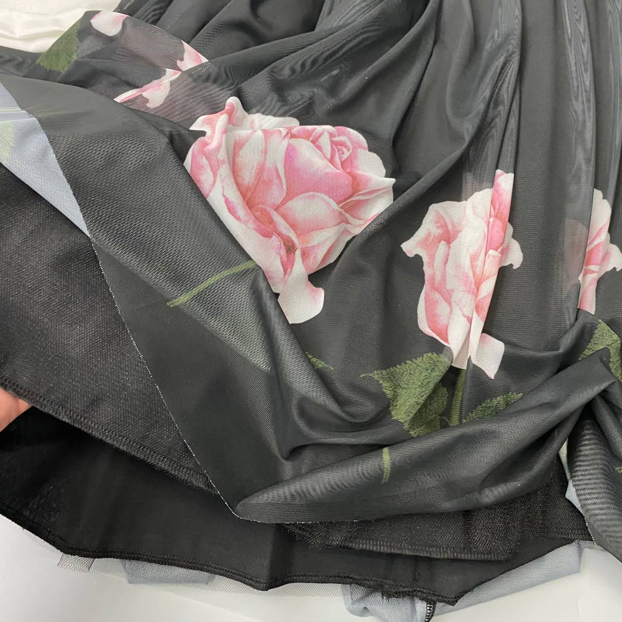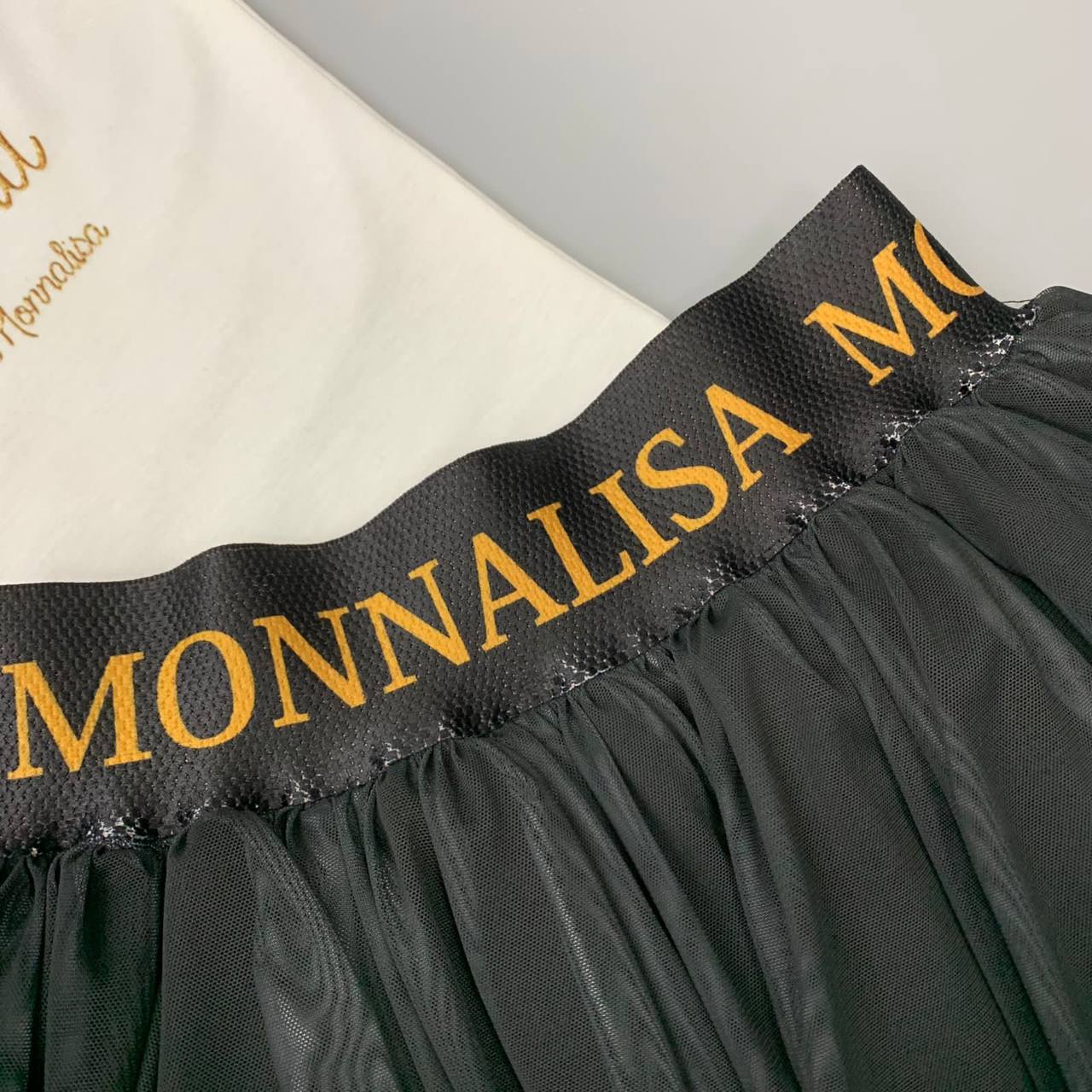 Костюм MONNALISA LUX-84476 состоит из футболки и юбки. Комплект выполнен в романтическом стиле. Белая футболка с ярким цветочным принтом. Юбка черного цвета с пышной структурой, декорирована крупными розами.