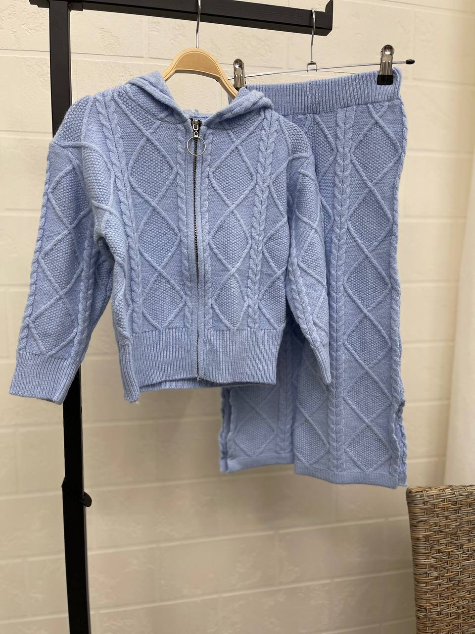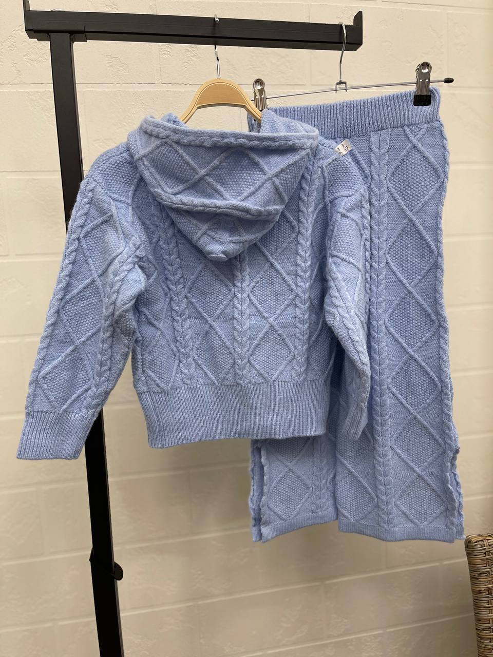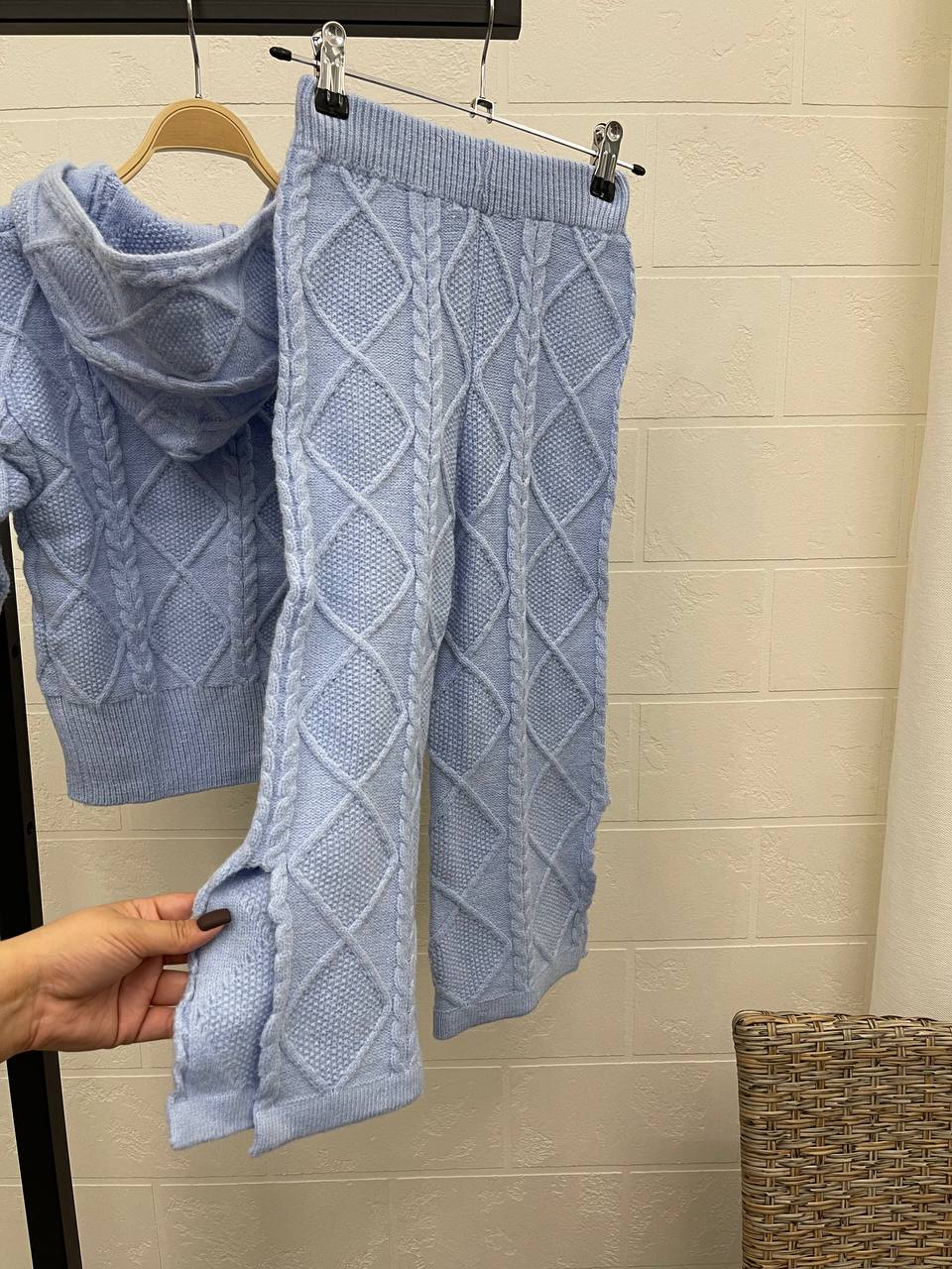 Костюм LUX-97126, представленный на фото, воплощает в себе комфорт и стиль. Этот вязаный костюм голубого цвета имеет кофту с капюшоном и штаны, которые создают единый образ. Он идеально подойдет для повседневного использования в прохладную погоду.