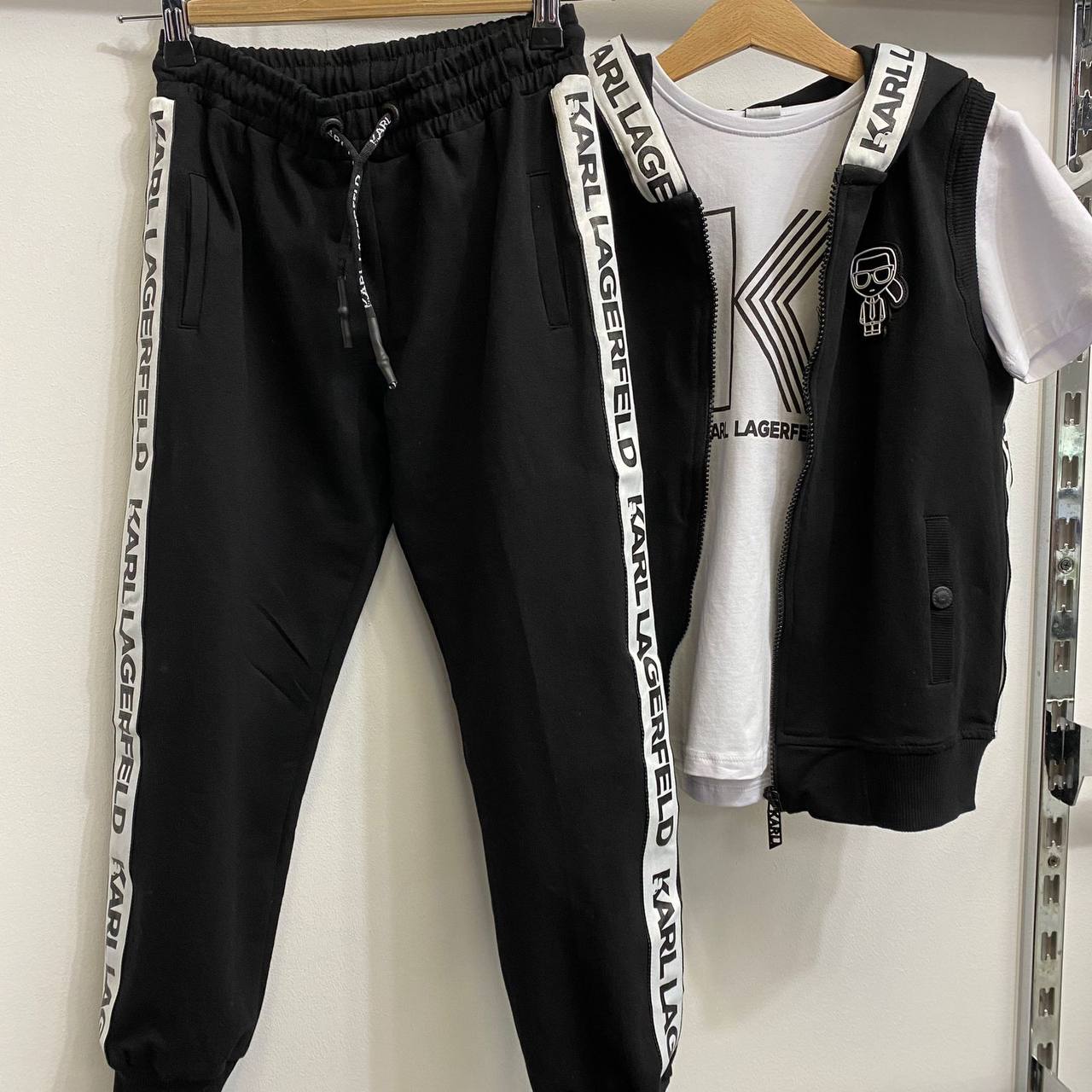 Костюм 3-ка LUX-91877 представляет собой стильный спортивный комплект, состоящий из трех элементов. Комплект выполнен в черном цвете с белыми полосами на штанах и жилете. Этот костюм подойдет для повседневной носки, занятий спортом или создания стильного образа.