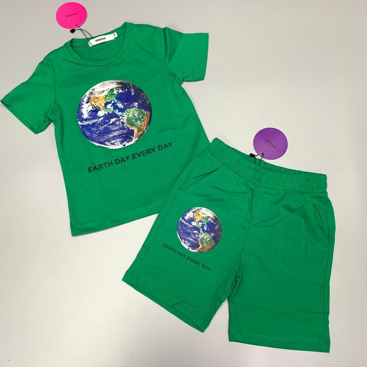 Представляем вам яркий и стильный комплект для детей от бренда PANGAIA. Этот комплект, состоящий из футболки и шорт, выполнен в насыщенном зеленом цвете и украшен принтом с изображением Земли и надписью "EARTH DAY. EVERY DAY.". Модель идеально подходит для повседневной носки, прогулок и активного отдыха, подчеркивая заботу об окружающей среде.