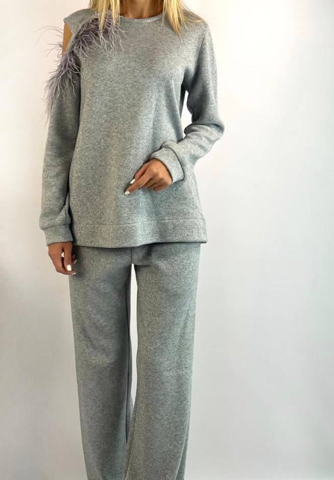 Этот стильный женский костюм сочетает в себе комфорт спортивной одежды и элегантность благодаря оригинальному декору. Серый костюм-двойка, состоящий из свитшота с асимметричным вырезом на плече, украшенным нежными перьями, и брюк прямого кроя, идеально подойдет для создания расслабленных, но при этом модных образов.