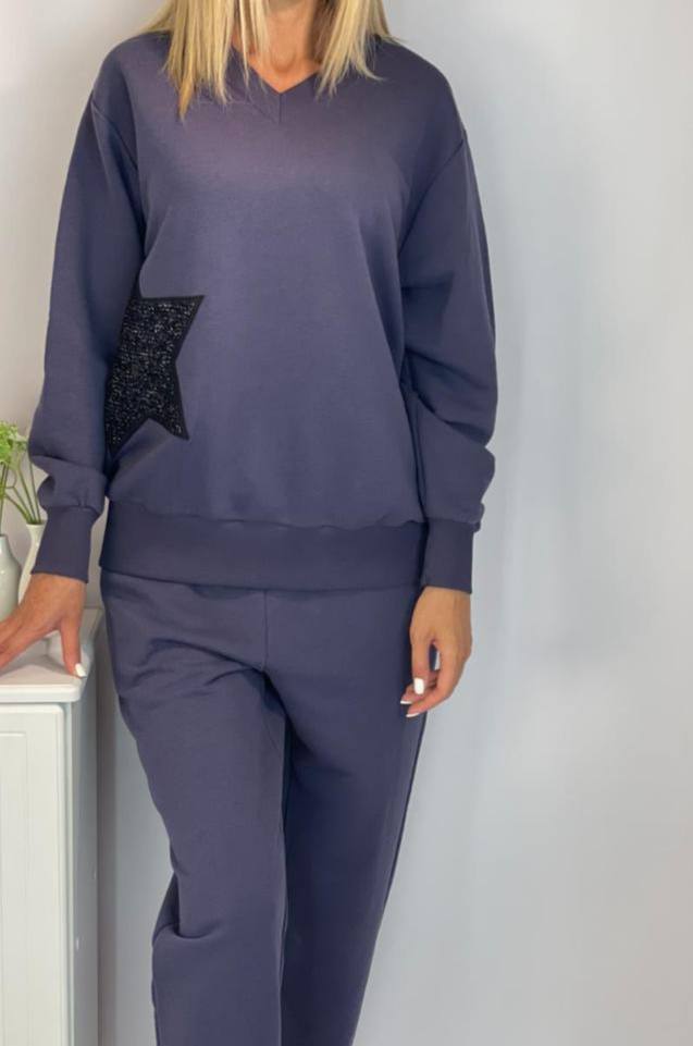 Этот темно-синий костюм от Luxe-crime — идеальное сочетание стиля и комфорта. Комплект состоит из джемпера свободного кроя с V-образным вырезом и декором в виде крупной звезды из пайеток, а также удобных брюк. Отличный выбор для создания непринужденных образов.